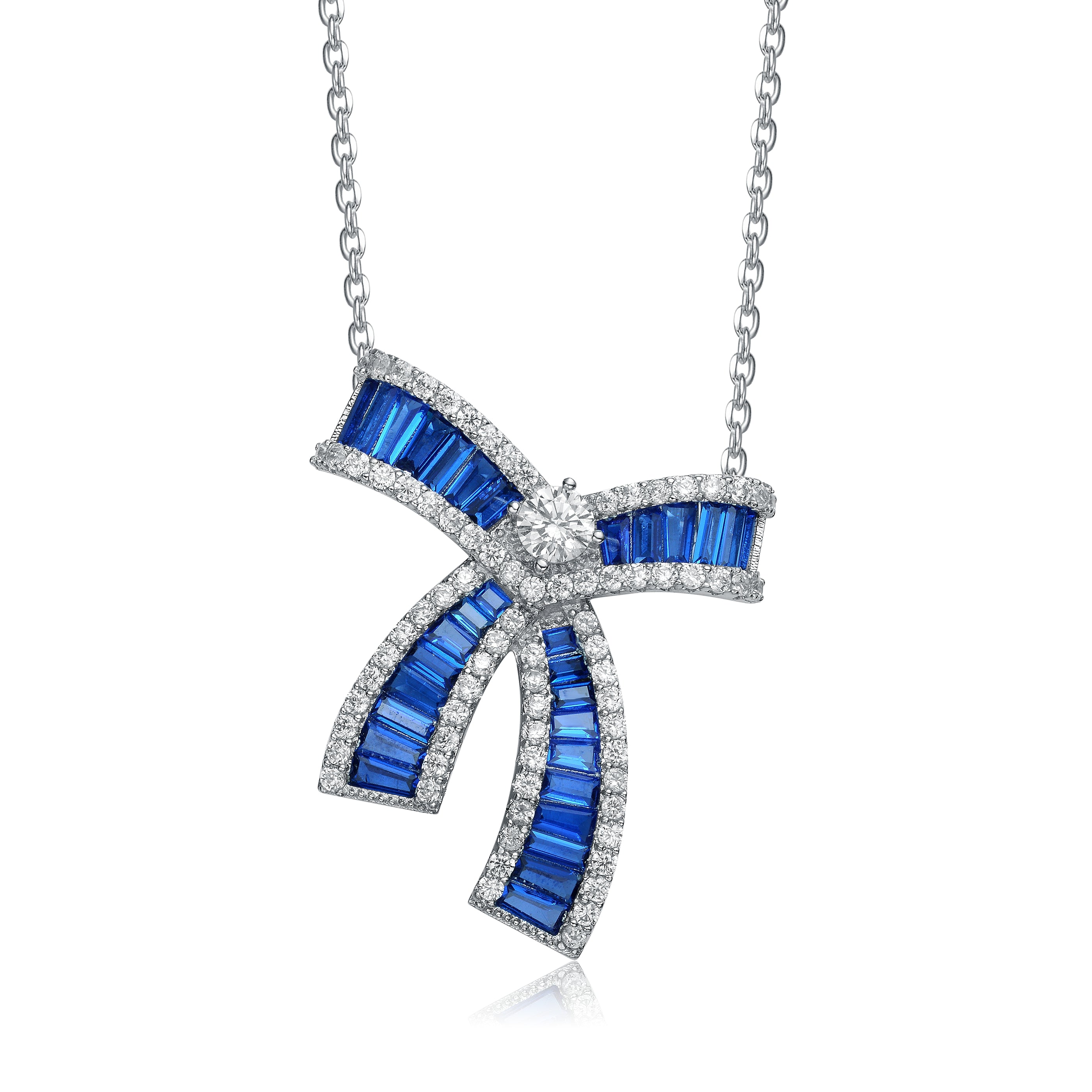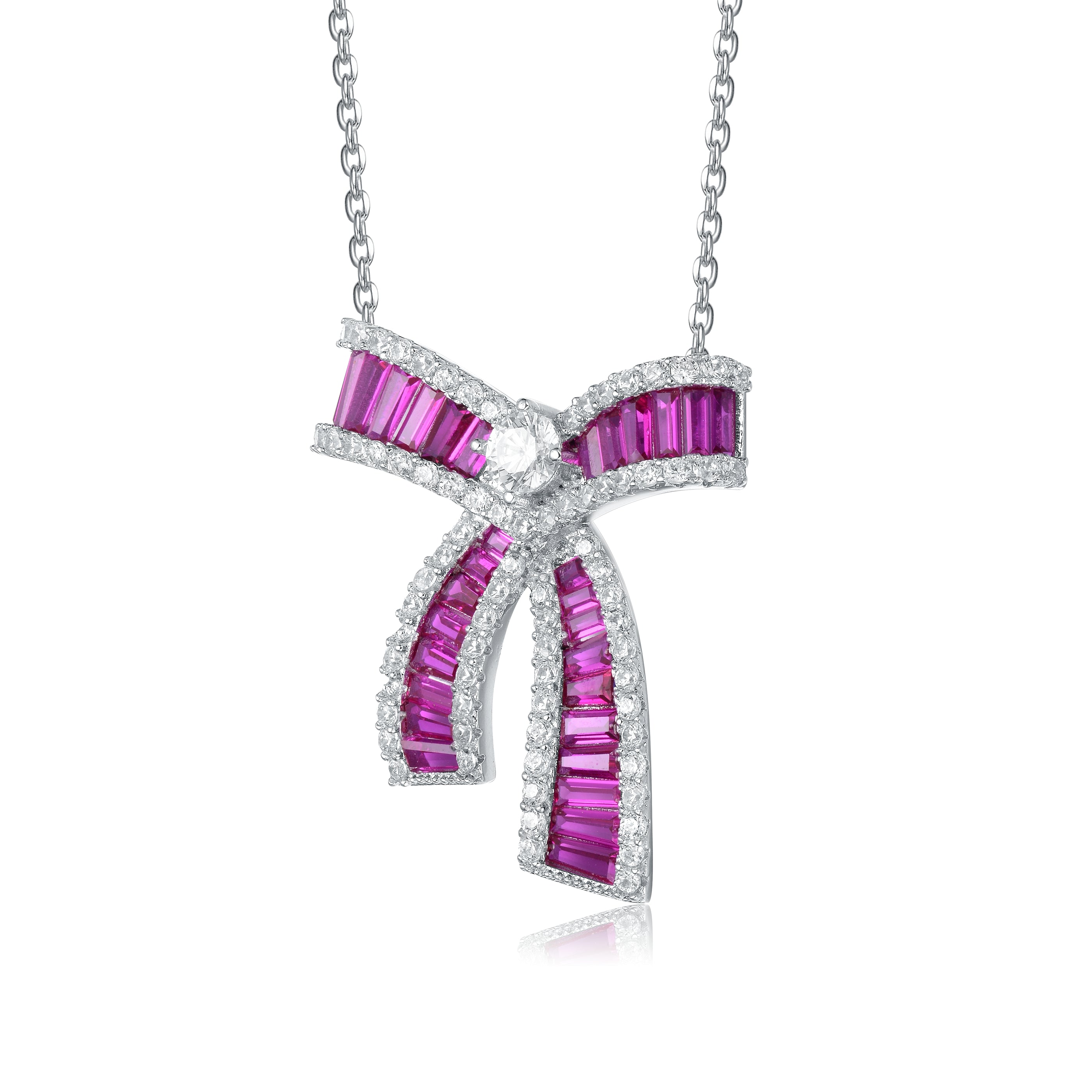 Elegant Sterling Silver Cubic Zirconia Bowtie Pendant Necklace. These dainty bowtie-shaped necklace is decorated with clear round-cut and baguette in pink and sapphire blue cubic zirconia stones. Crafted of .925 sterling silver, with rhodium plating, these fantastic earrings secure with spring ring closure. Also available in Sapphire cubic zirconia.