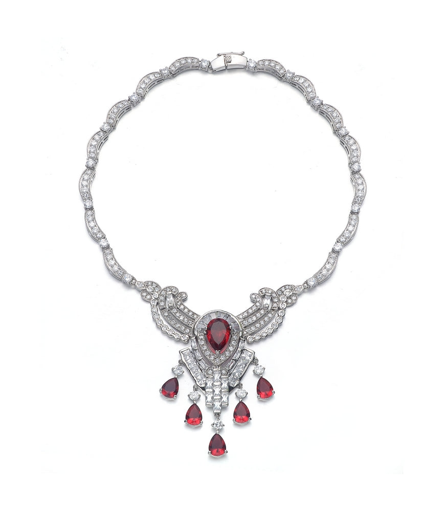 This fancy necklace features pear-cut cubic zirconia stones surrounded with smaller round-cut stones. Crafted of .925 sterling silver, the necklace secures with a box clasp. Enhance your beauty with this fancy masterpiece. Available in Ruby Red and Sapphire Blue stone color.