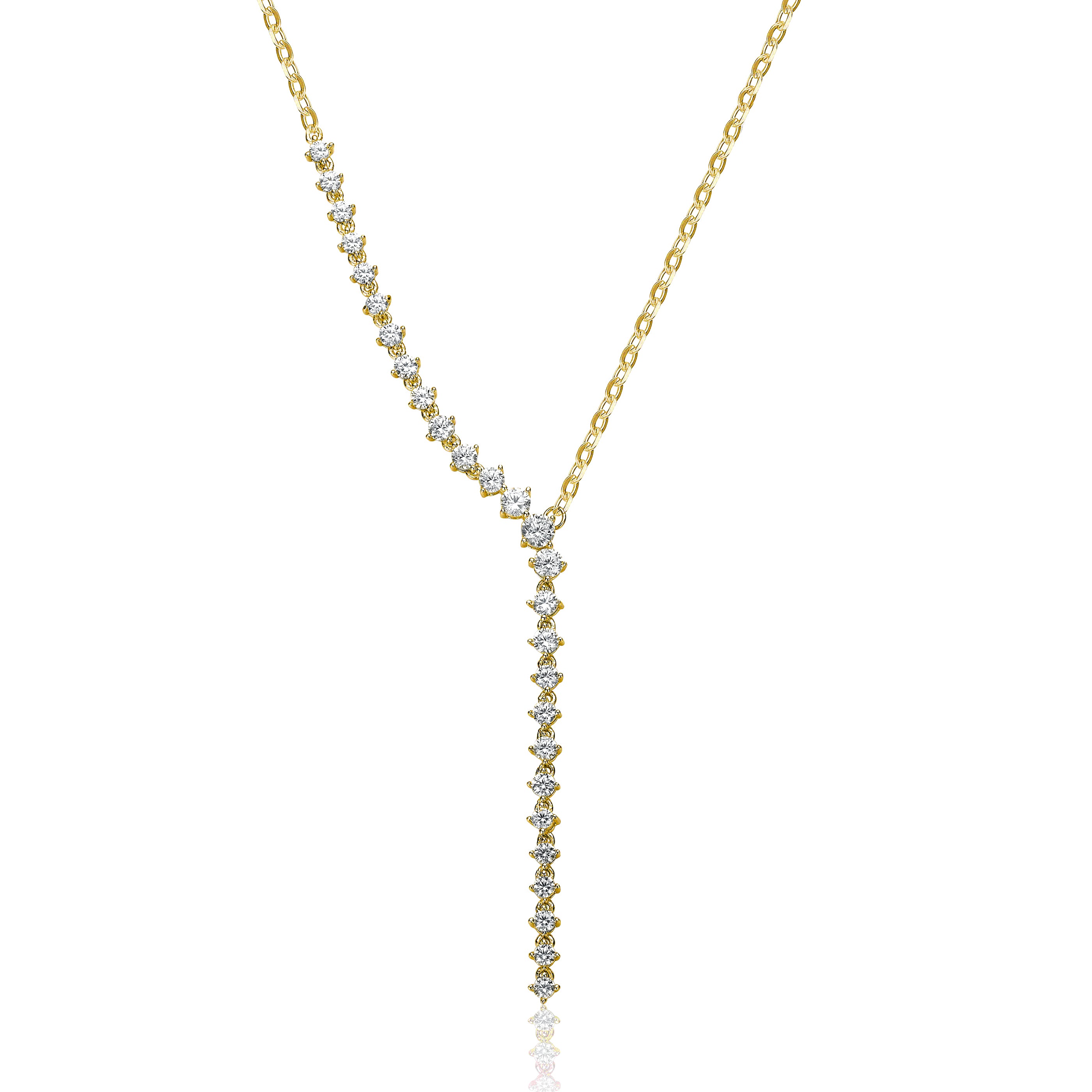 Glittering round brilliant cut cubic zirconias adorn this waterfall y-necklace, prong set and arranged on one side in an asymmetrical style. Designed in brightly polished rhodium-plated sterling silver with a secure lobster clasp in the back. Choose from our different style options. Also available in gold plating.