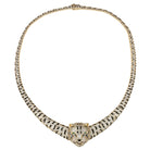 An avant-garde necklace plated in 14K gold, adorned with cubic zirconia. Centered on a leopard's face with emerald green eyes, it replicates leopard print with crystals and black stones. A masterful statement piece, discreetly closing with a blend-in lock snap.