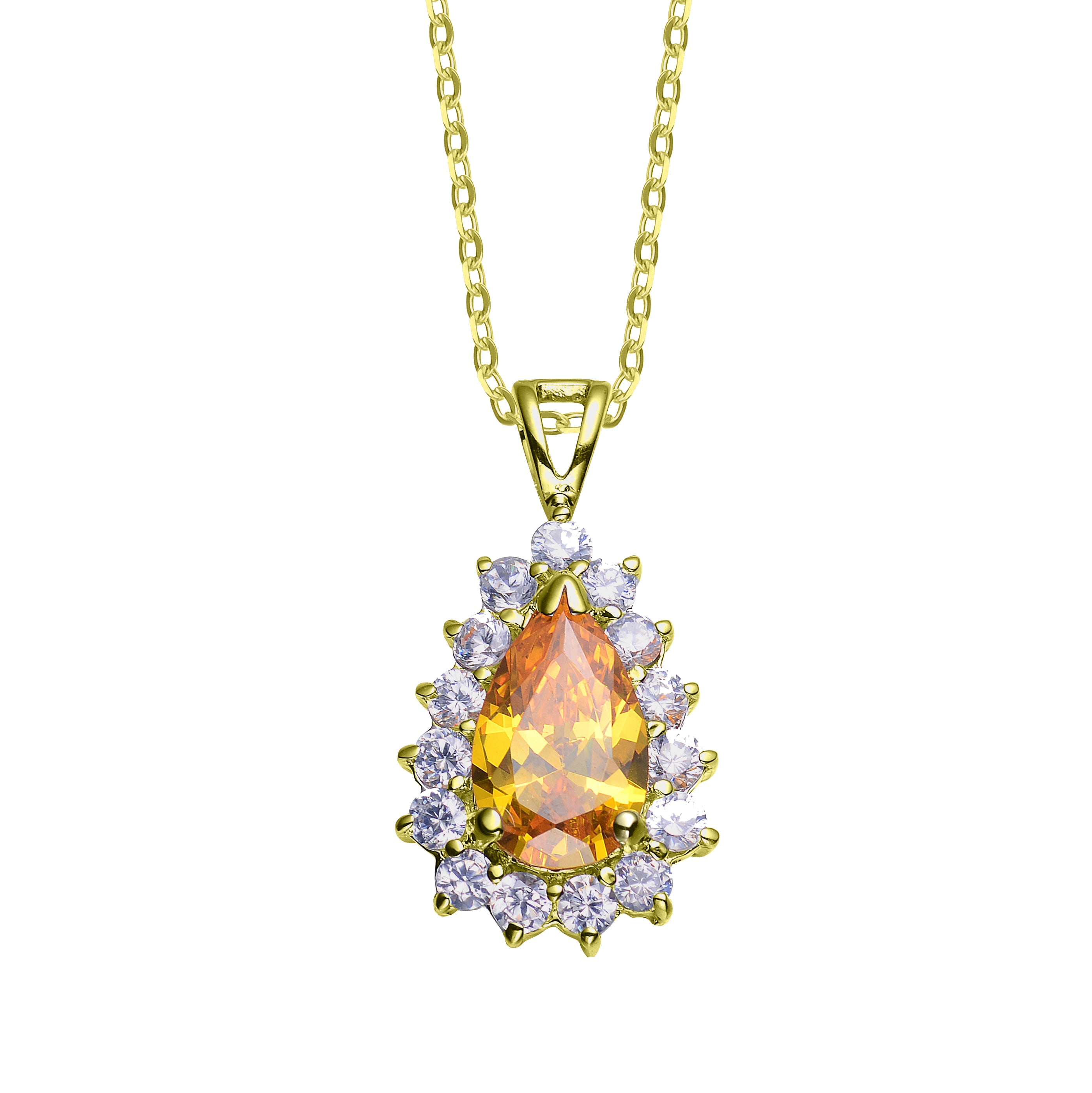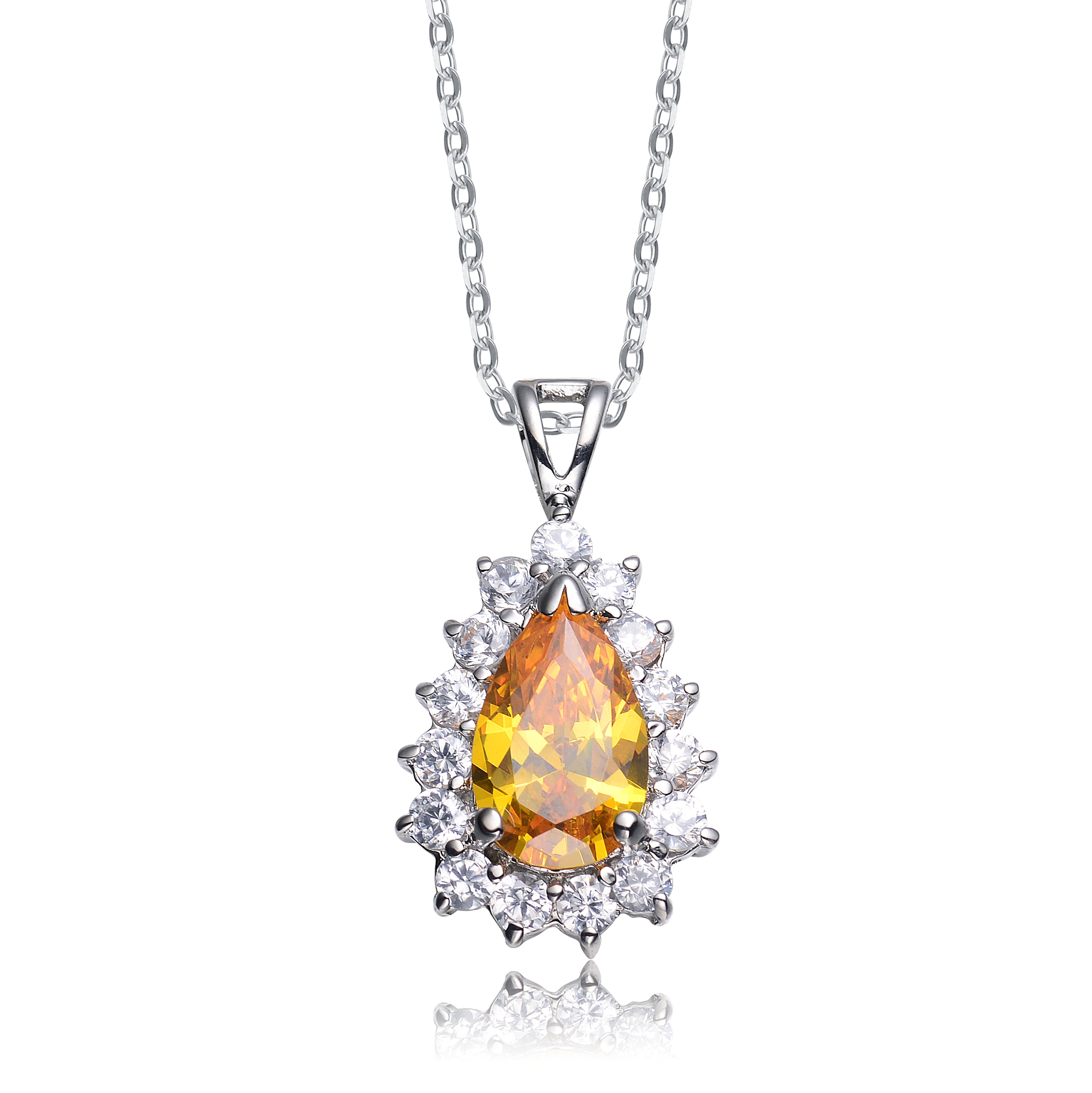 This stunning pendant features a pear-shaped yellow cubic zirconia at the center, exquisitely framed by clear cubic zirconia stones creating a radiant halo. Crafted from sterling silver with a rhodium plating, this pendant offers both brilliance and durability. The vibrant yellow stone captures the light beautifully, while the surrounding clear stones enhance its sparkle. Suspended from a classic sterling silver chain, this piece of jewelry is both elegant and eye-catching, making it a perfect accessory for adding a touch of glamour to any outfit. Ideal for special occasions or everyday elegance, this pendant is a must-have addition to your jewelry collection.
