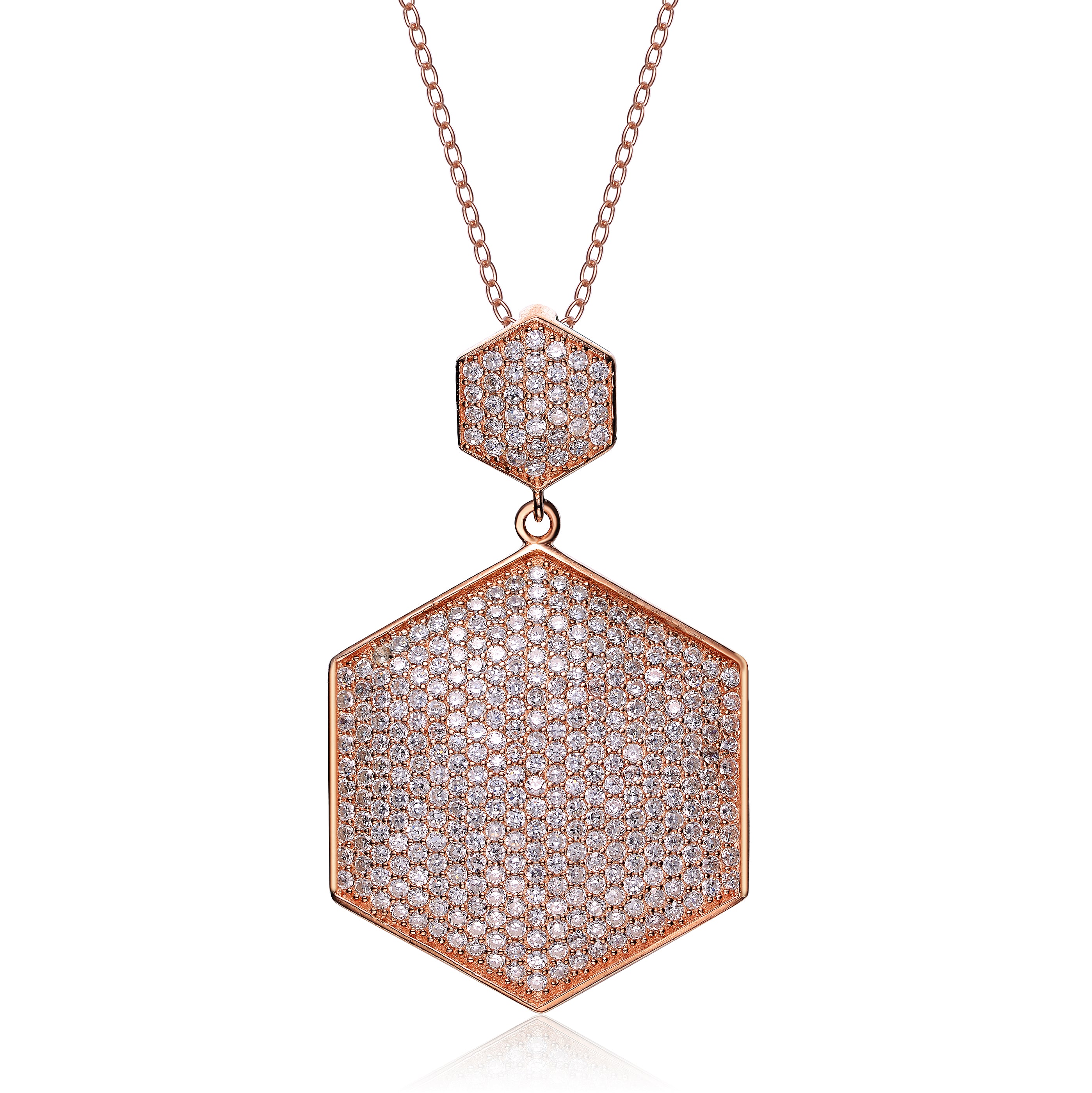 This rose gold overlay necklace is sure to be flattering to any outfit. It features pave clear cubic zirconia stones in the shape of a hexagon.
