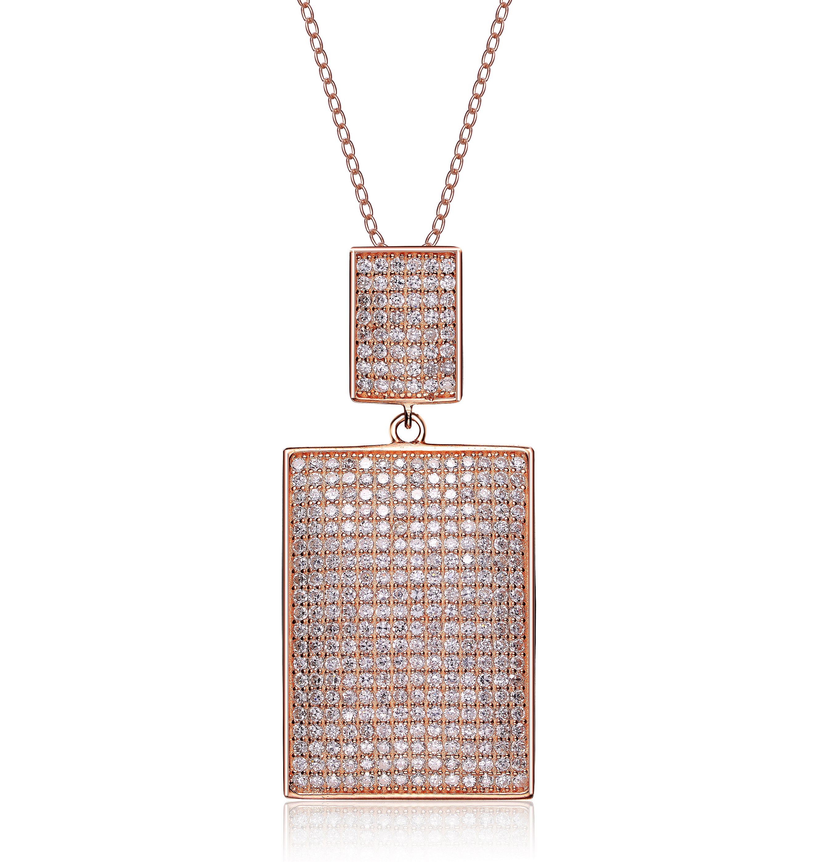 This rose gold overlay necklace is sure to be flattering to any outfit. It features pave clear cubic zirconia stones in the shape of a rectangle.