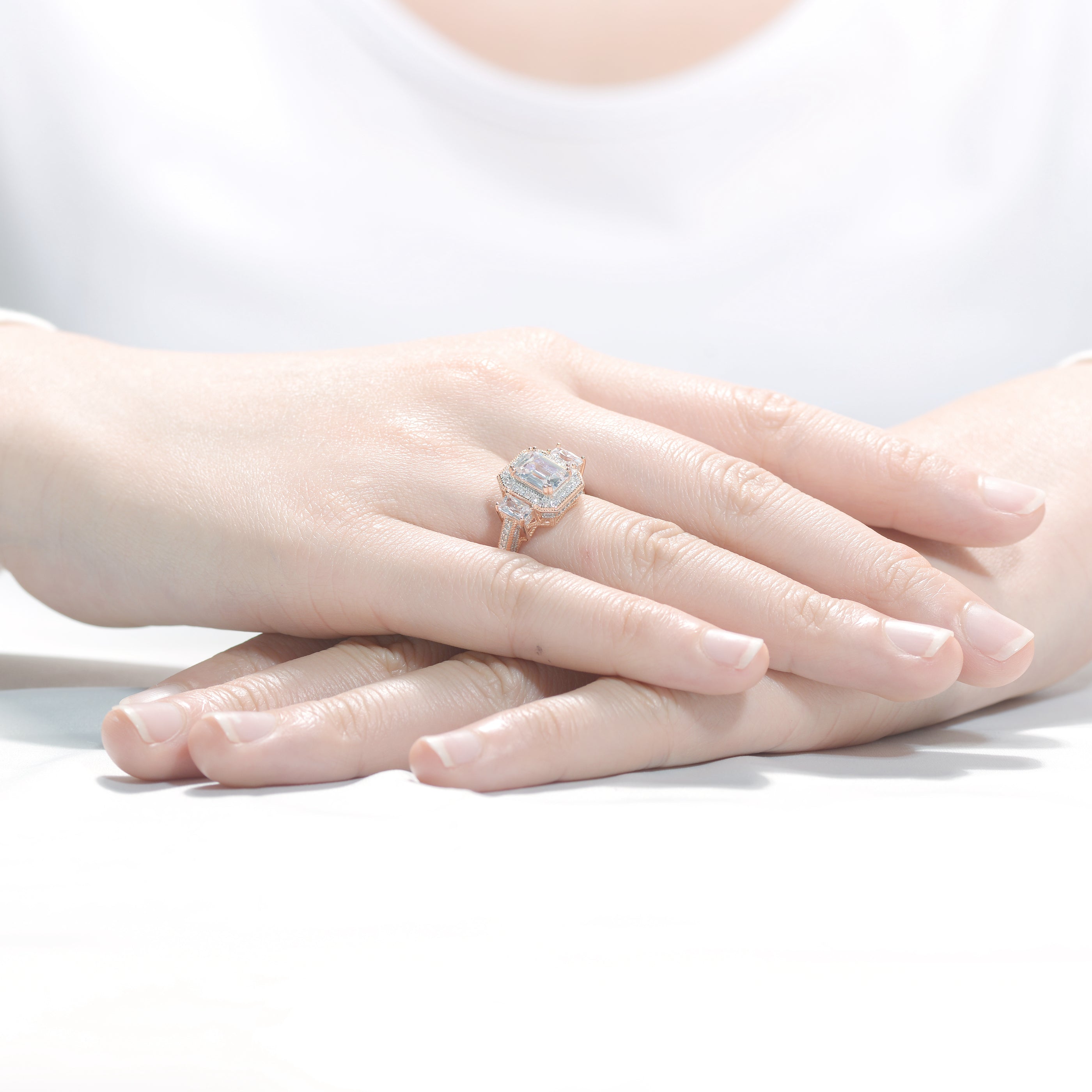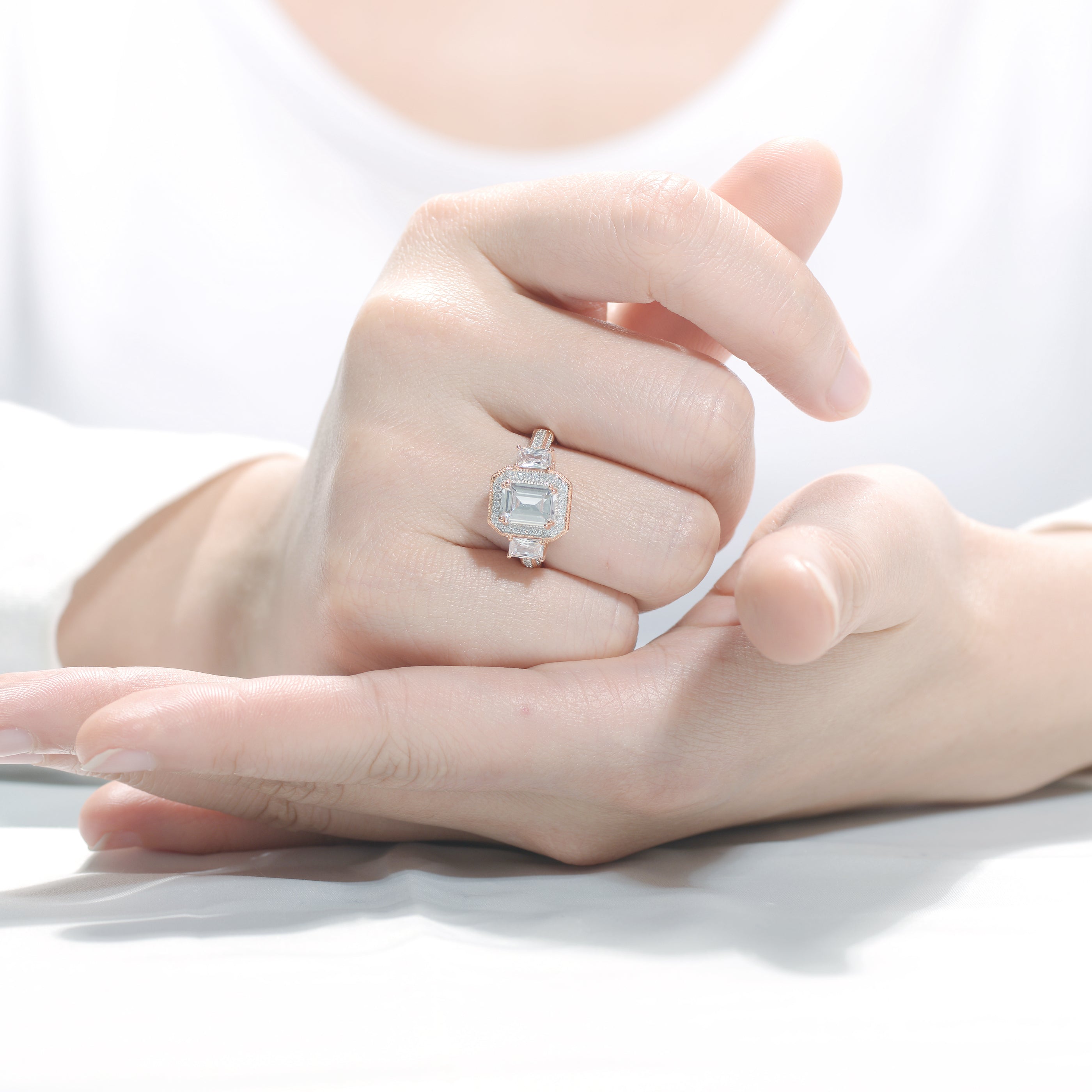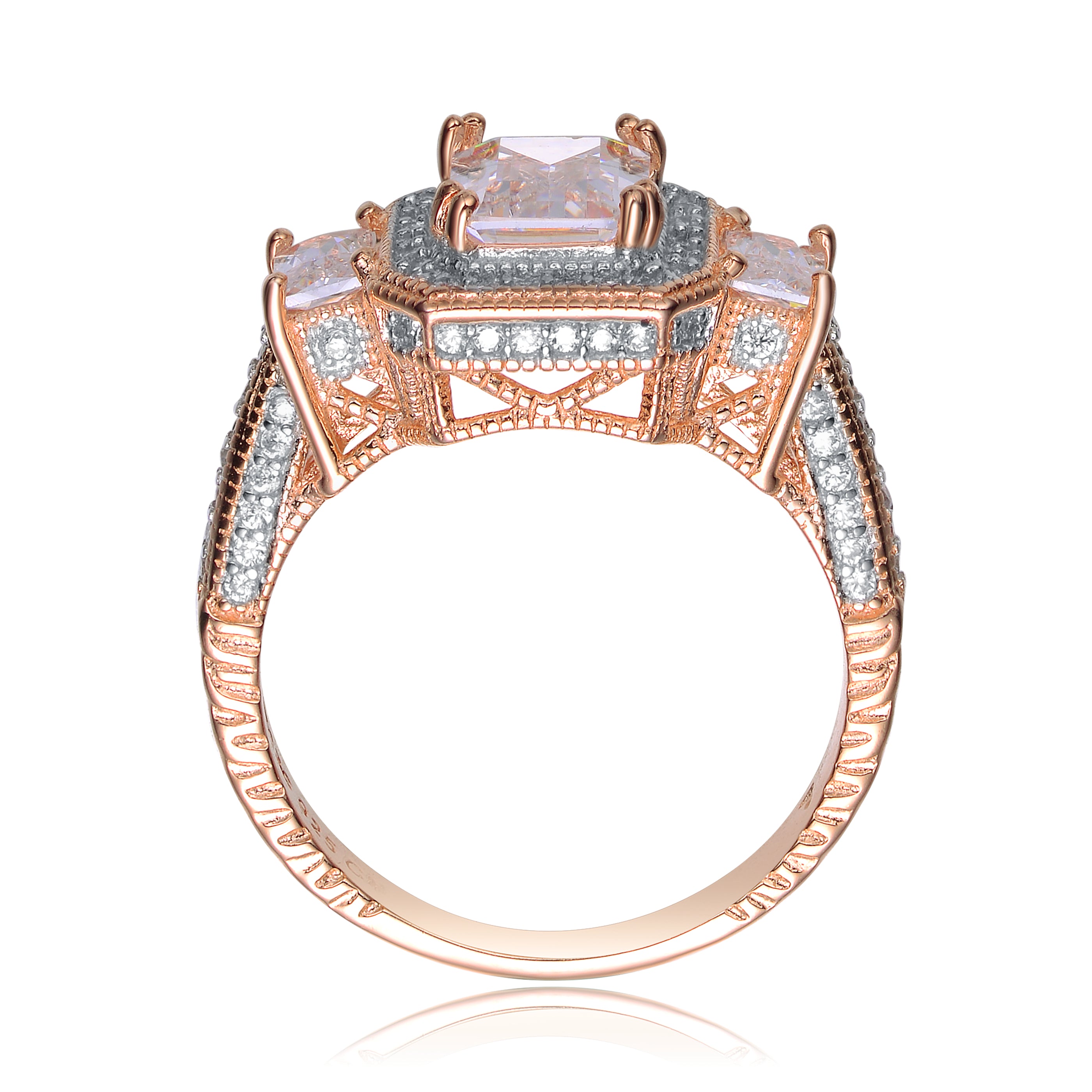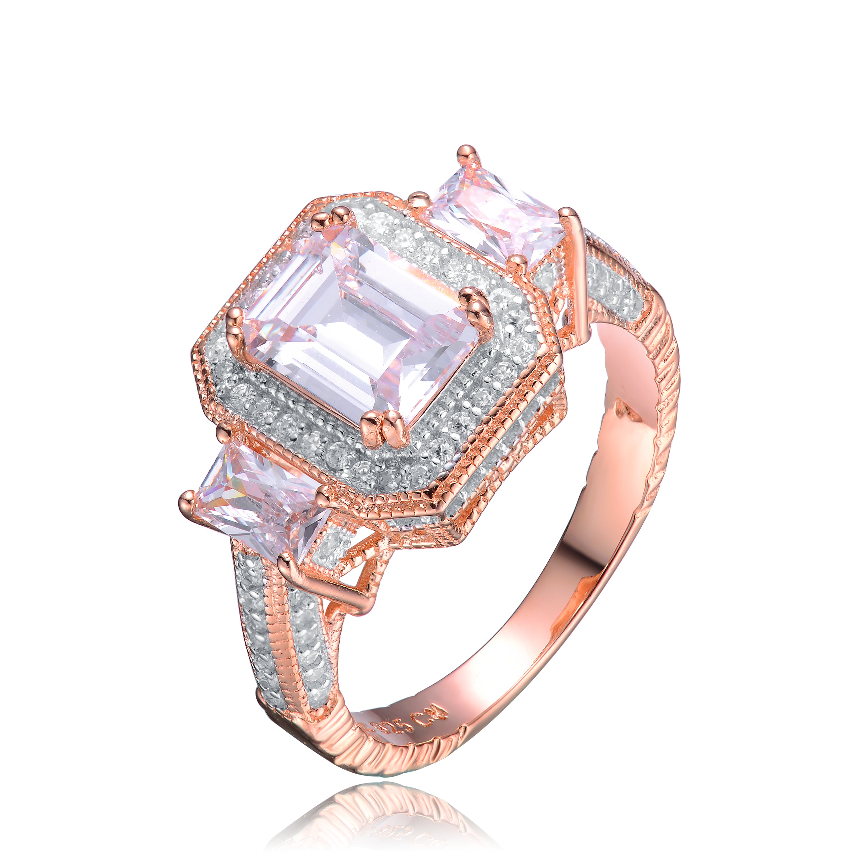 This rose gold plated sterling silver rin is adorned with beautiful diamoned alike cubic zirconia. Whether worn for a special occasion or as a statement piece, it’s sure to turn heads and capture attention.