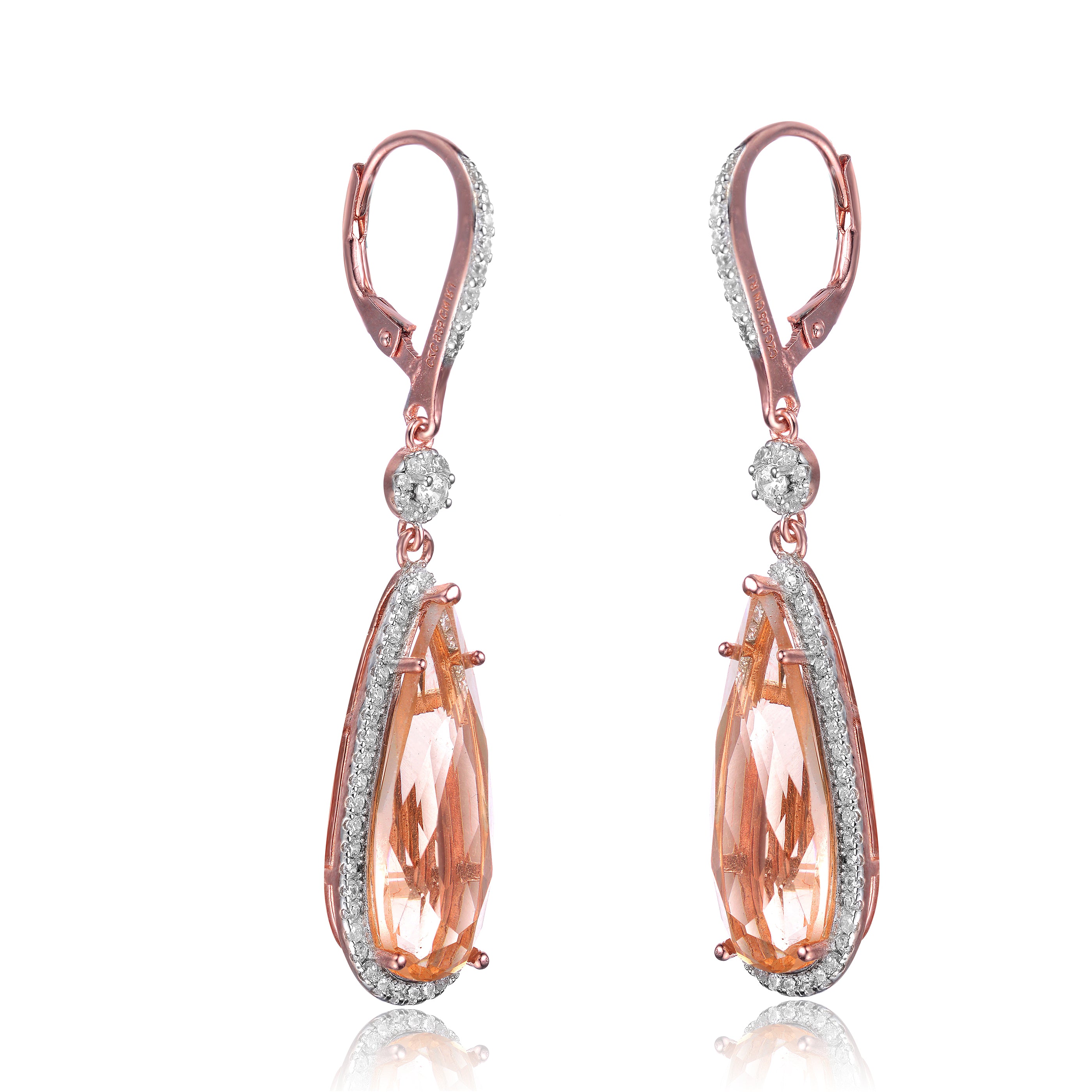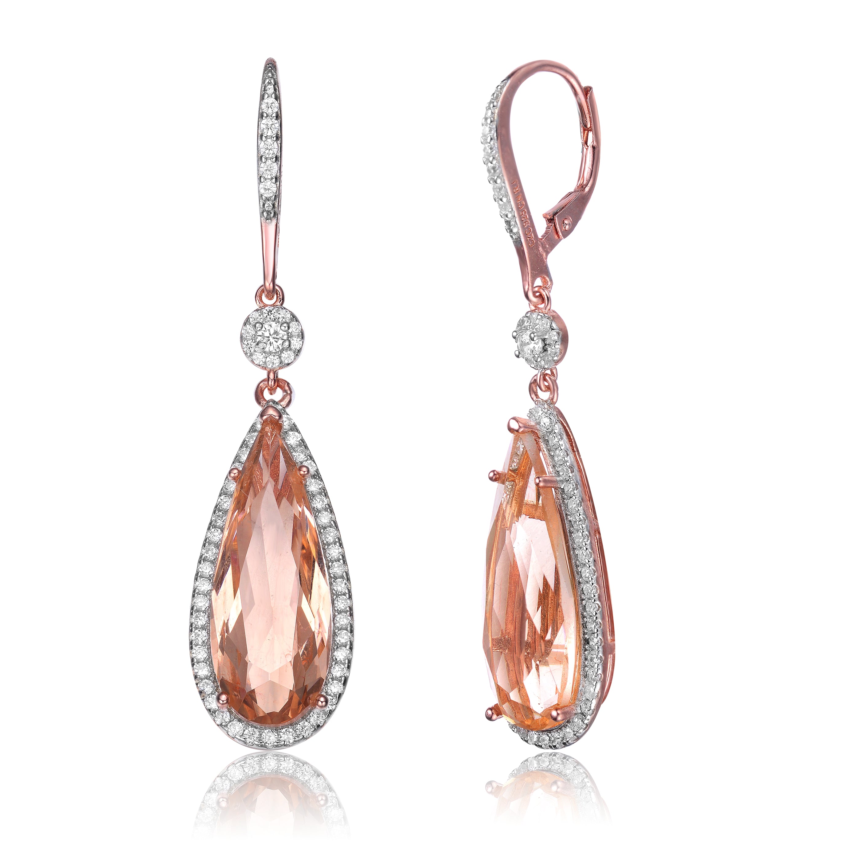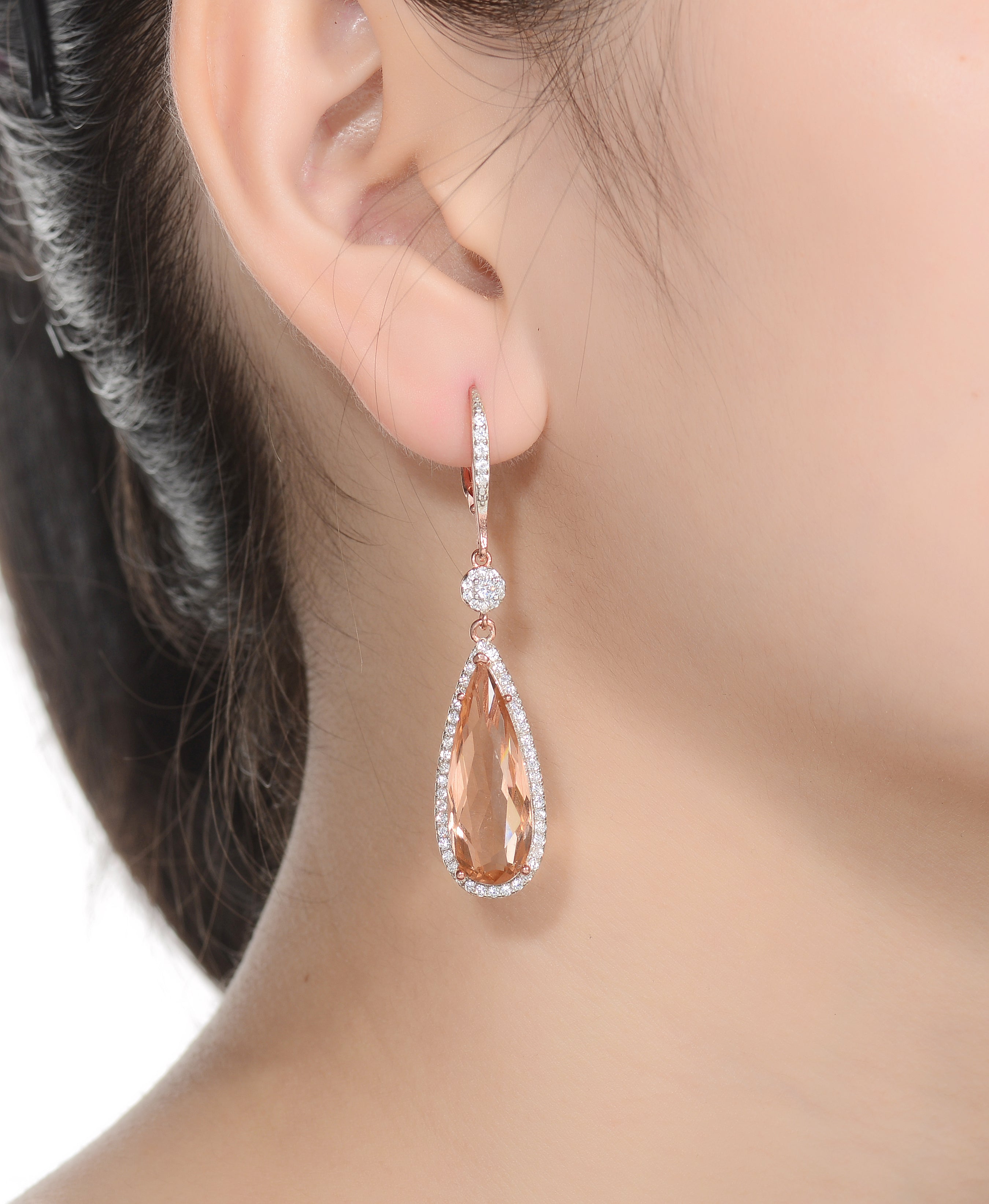 A large pear shaped morganite cubic zirconia accents in the middle with small round cut clear gems beautifully paved around it. These dangle earrings are made from .925 sterling silver plated with rose gold and secured with leverback.