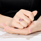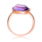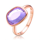 This large purple cubic zirconia solitaire ring is to die for. The soft rose gold band offers a lovely contrast to the purple stone.