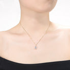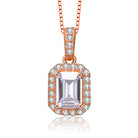 This exquisite pendant features a central, emerald-cut cubic zirconia stone, prong-set and surrounded by a halo of round-cut cubic zirconia stones. Crafted from sterling silver with a rose gold plating, the pendant exudes a warm and sophisticated hue. The bale is also adorned with smaller round-cut stones, adding extra sparkle and allure. This piece combines classic elegance with modern design, making it a perfect choice for those seeking a luxurious accessory without the high-end price tag.