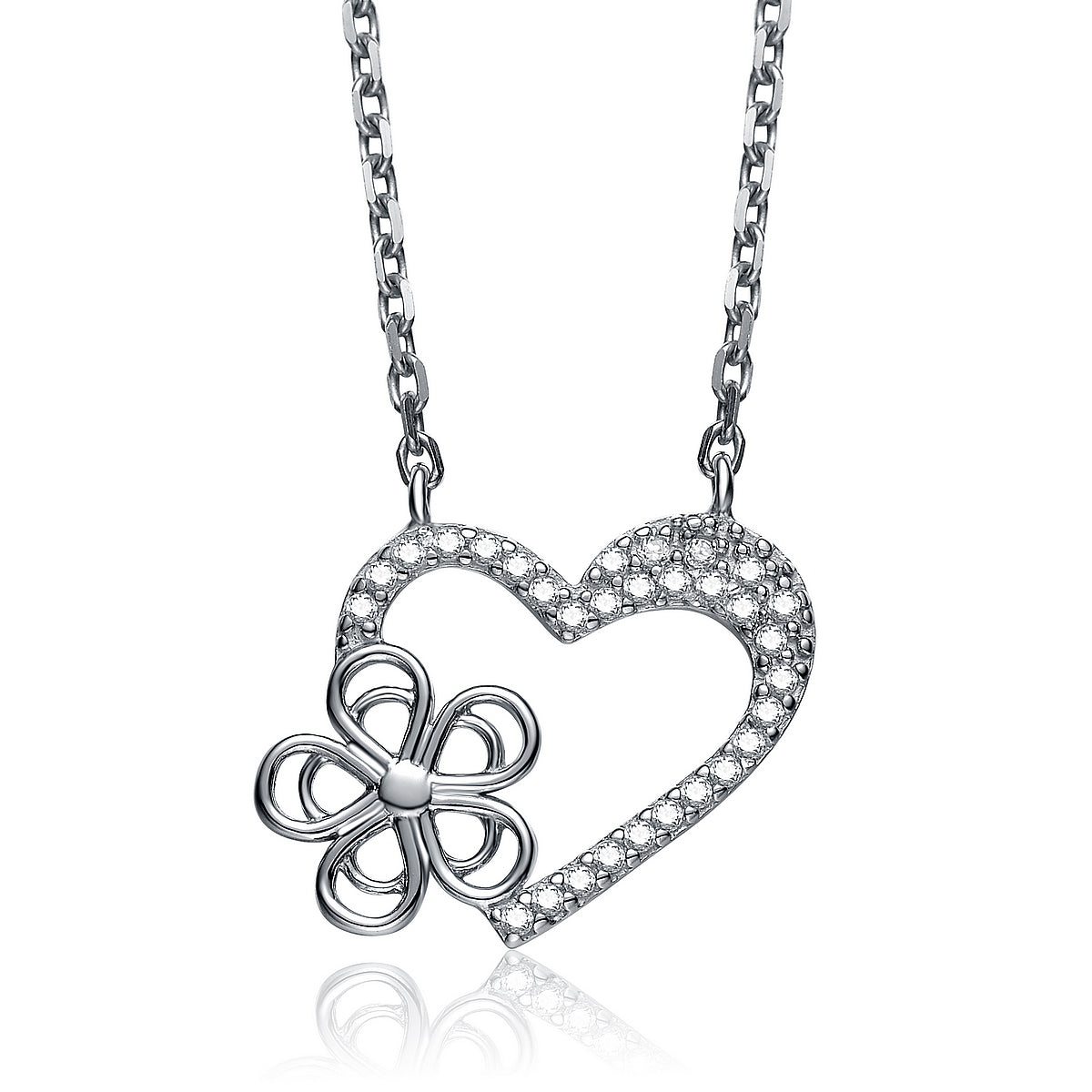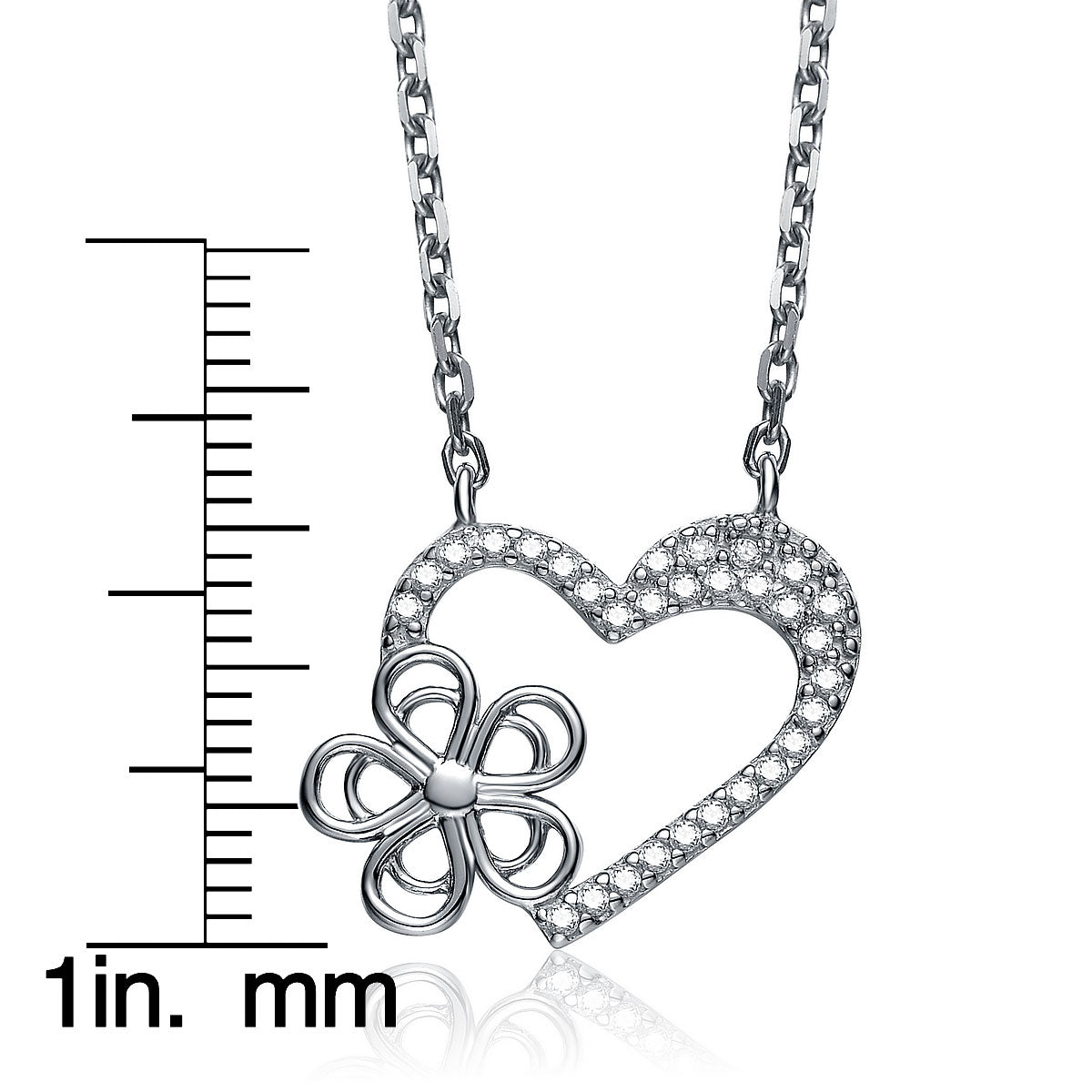 This dainty necklace features a heart and flower shape decorated with shimmering white round-cut cubic zirconia stones. Crafted of .925 Sterling silver, with rose plating, the necklace secures with a spring ring clasp.