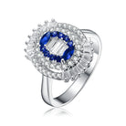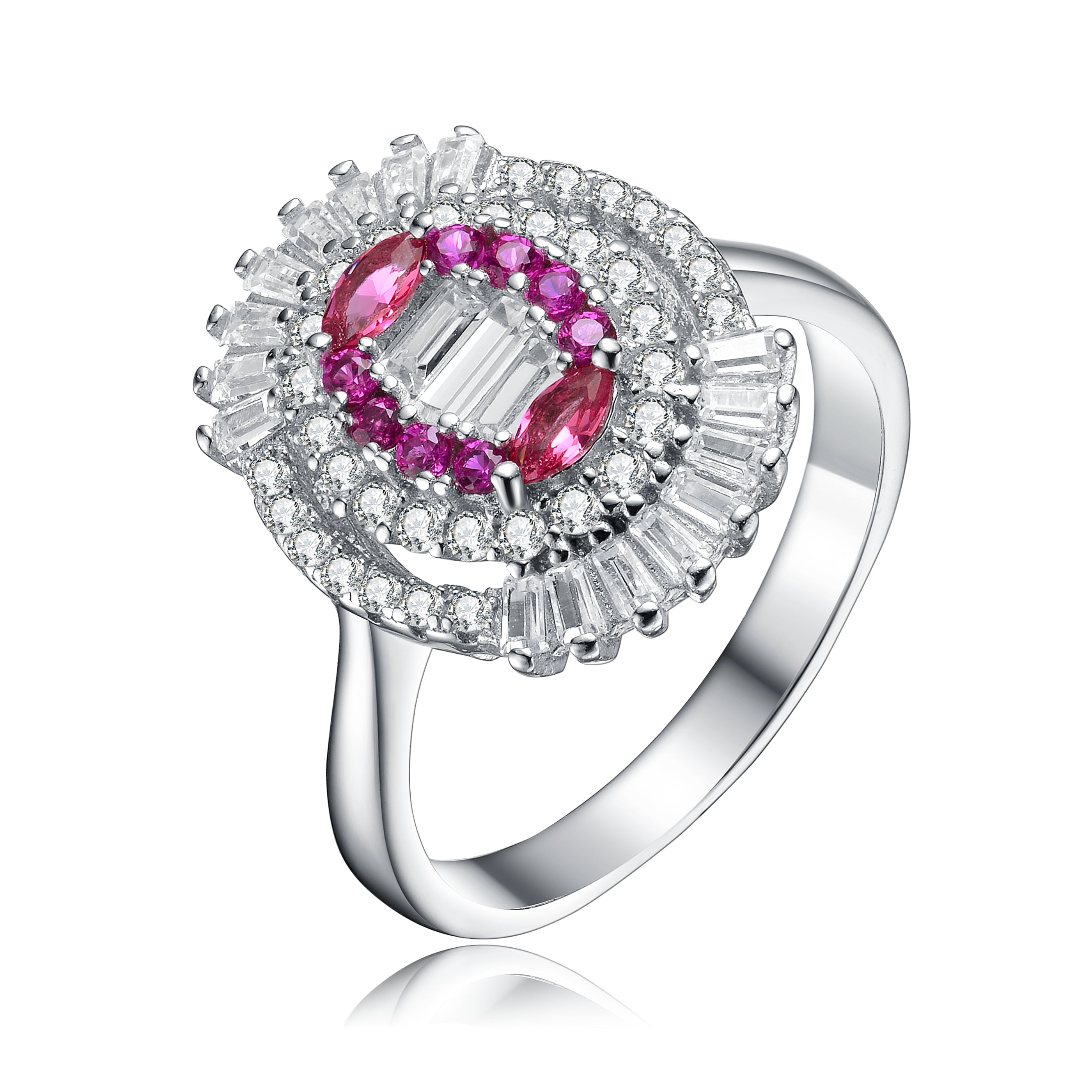 This exquisite ring features a central, rectangular-cut ruby surrounded by a halo of small round pink stones and an outer halo of clear cubic zirconia. The band splits near the top, accentuating the ring’s design with additional clear cubic zirconia set along the shoulders, adding to its luxurious appeal. The combination of the vibrant ruby centerpiece and sparkling cubic zirconia makes this piece an eye-catching accessory that exudes sophistication. Perfect for special occasions or as a statement piece, this ring adds a touch of elegance and glamour to any outfit.