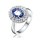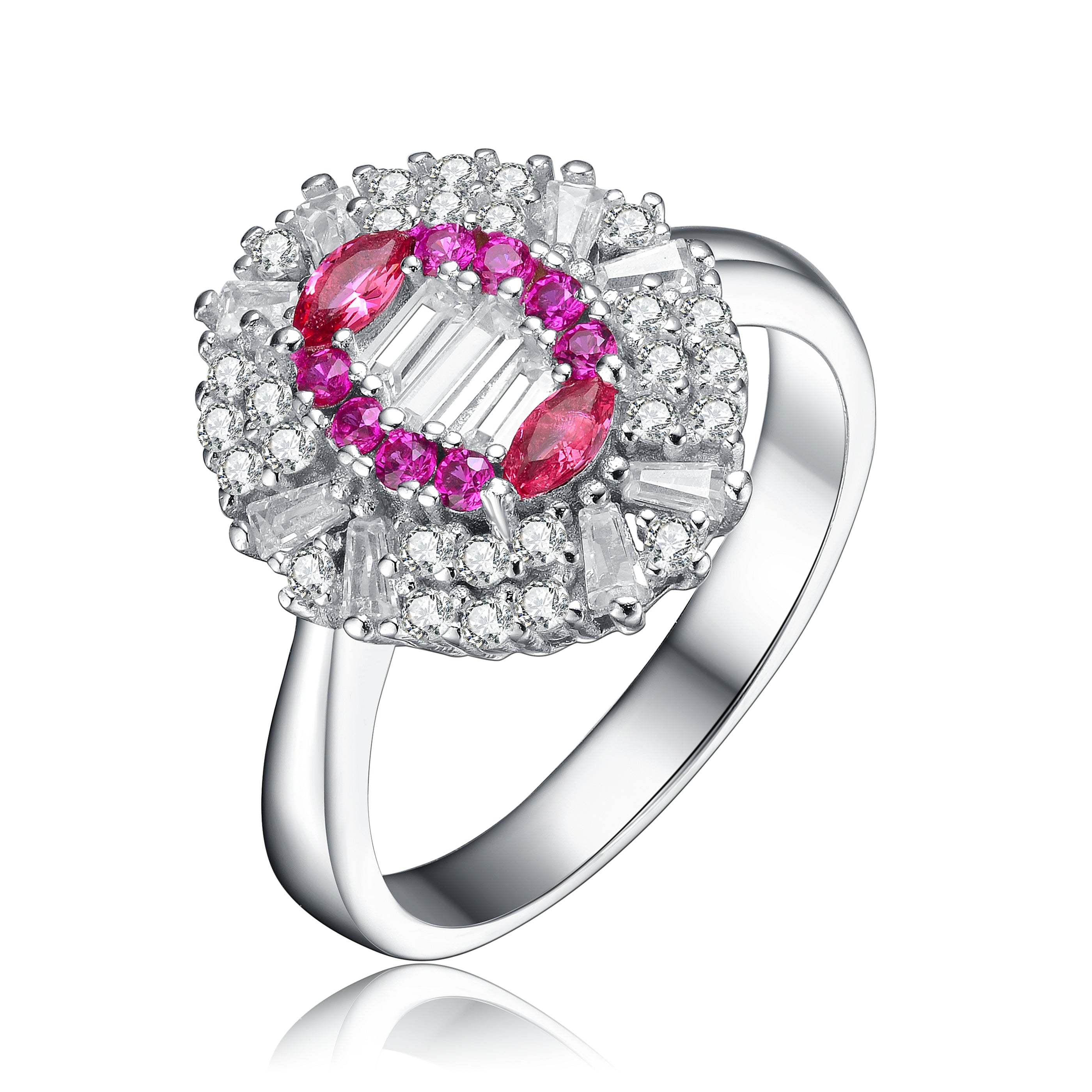 This exquisite ring features a central oval-cut ruby surrounded by a halo of sparkling cubic zirconia stones. Additional baguette-cut cubic zirconias are set on either side of the main stone, enhancing the ring’s luxurious appeal. The vibrant pink hue of the ruby contrasts beautifully with the clear cubic zirconias and the polished sterling silver band, making it an eye-catching piece of jewelry. Perfect for special occasions or as a statement accessory, this ring adds a touch of elegance and sophistication to any outfit.