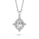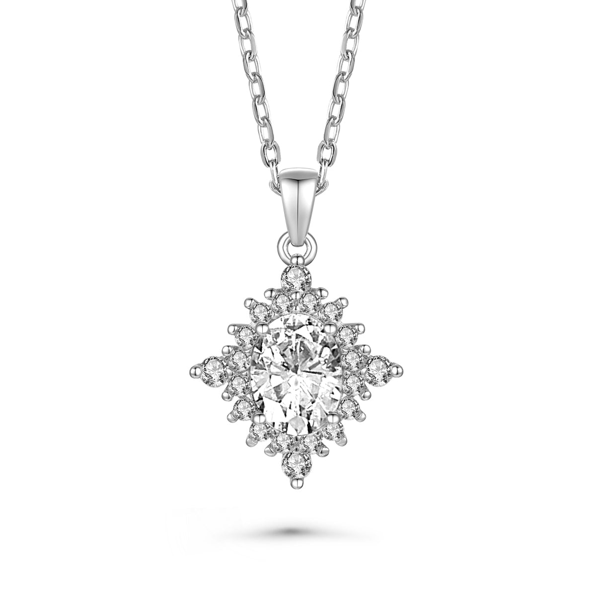 Classy Statement Pendant Necklace. This Diamond shape cubic zirconia pendant necklace feature center stage in this simple, yet very elegant pendant. The round brilliant cubic zirconia is set in, and dangles gracefully from a delicate rolo chain. It secures with a spring ring closure.