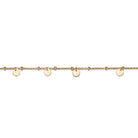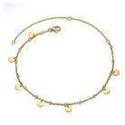 Sterling Silver 14k Gold Plated Circle Disc Dangle Charm Anklet, Adjustable Length. Add another layer of enchantment to your favorite summer outfit and year-round with this pretty bead link sterling silver anklet, all coated in a rich 14k gold plating for added shine, color, and durability. Eye-catching circle dangle charms sit in even intervals on a cable rolo chain, bringing all the attention to you with their graceful movement. A lobster clasp and extension chain accommodate most lengths. Anklet measures: 7" with 1.25" +2” extension.