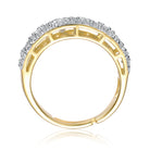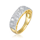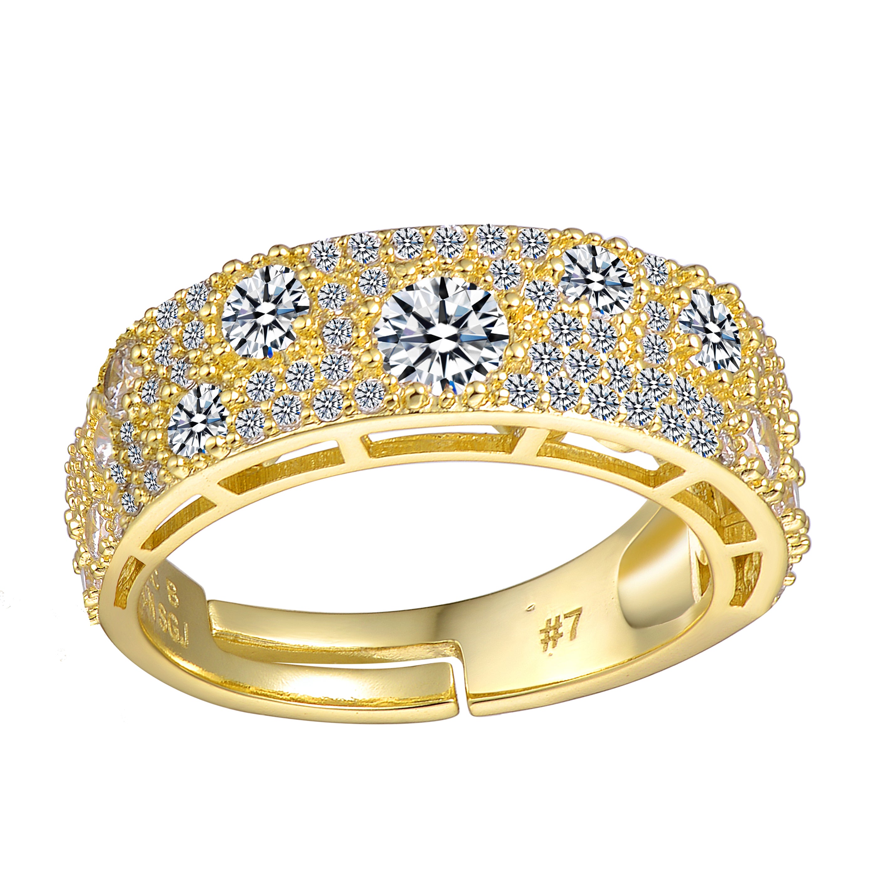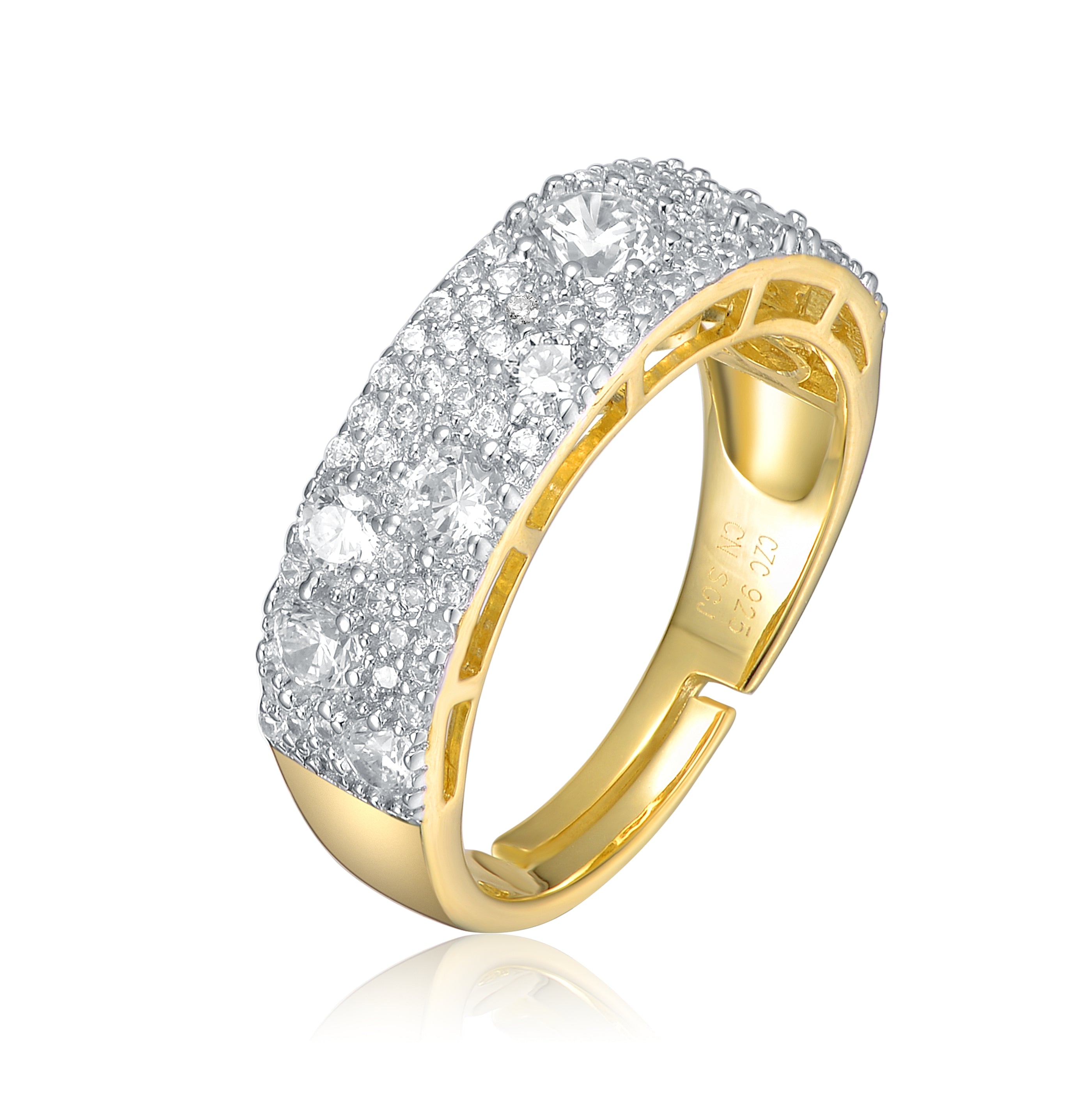 Sterling Silver 14k Gold Plated Cubic Zirconia Pave Band Ring. Give this glamorous sterling silver 14k gold plated ring to any loved one on an anniversary, birthday, or holiday, making it a picture-perfect moment for those who love celebrating. Mixed-cut cubic zirconia pave set across the band highlight the finger with fire and beauty. Pair this sparkling ring with a wedding band, stacked rings, or even an engagement ring with its endless stylistic versatilty. Ring is adjustable in size, accommodating different ring sizes.