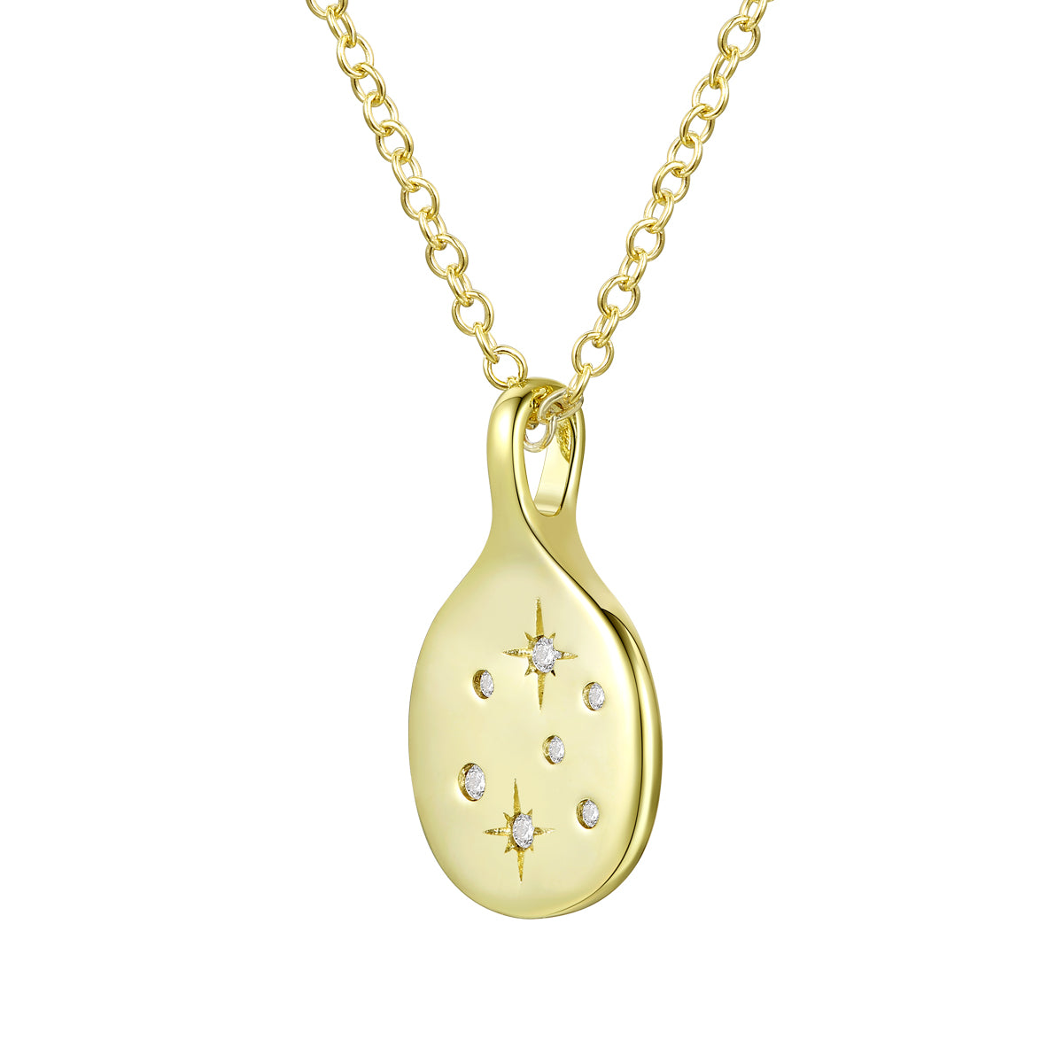 "Elegant 14K Gold Plated Cubic Zirconia Pendant Necklace. This pendant features round bar charm design with engraved stars, accented with clear round cubic zirconia stone, and cubic zirconia stones inlaid, connected to a chain on the top. Crafted with 14K Gold Plating and secure with spring ring closure. This item also makes a sensational gift for a special birthday or occasion.