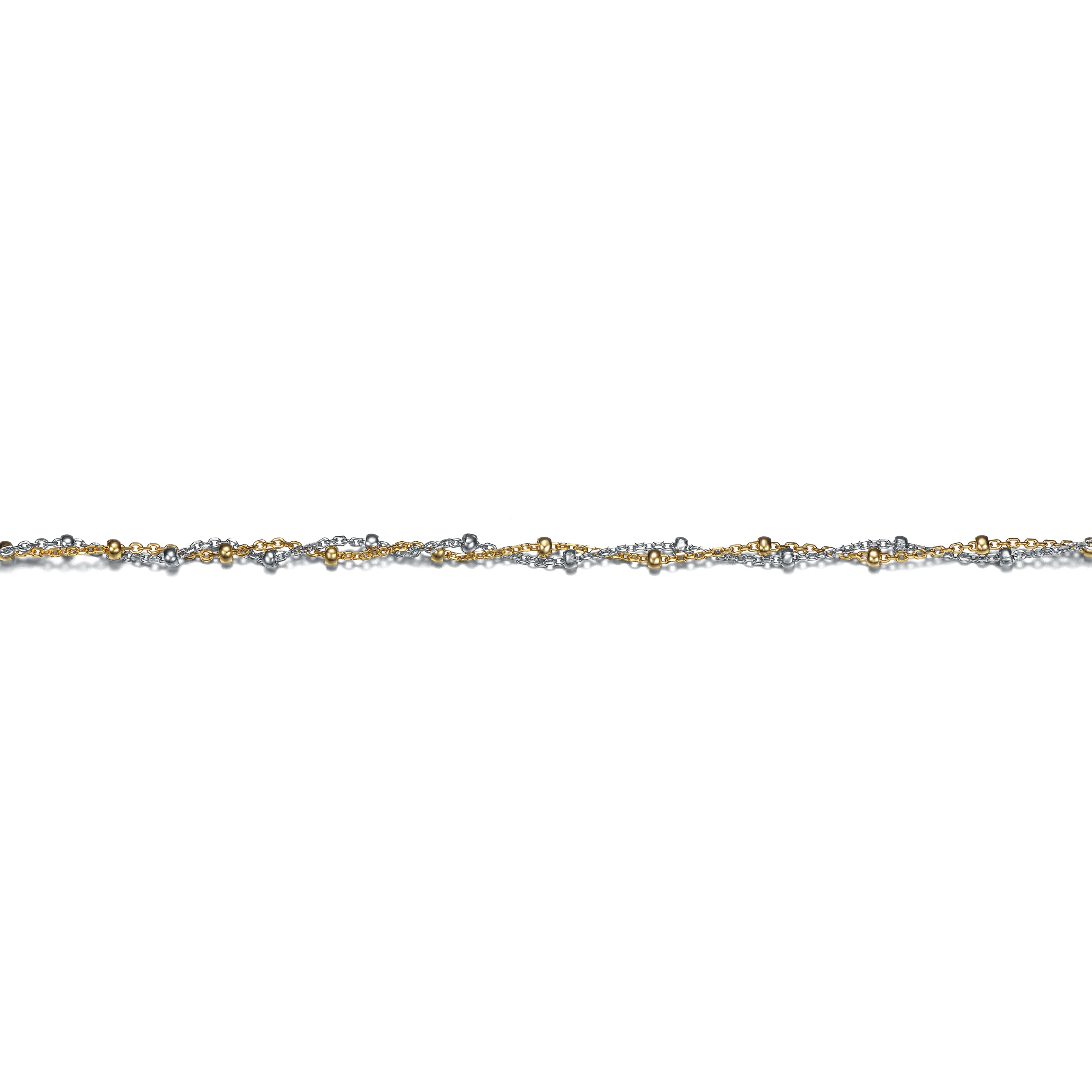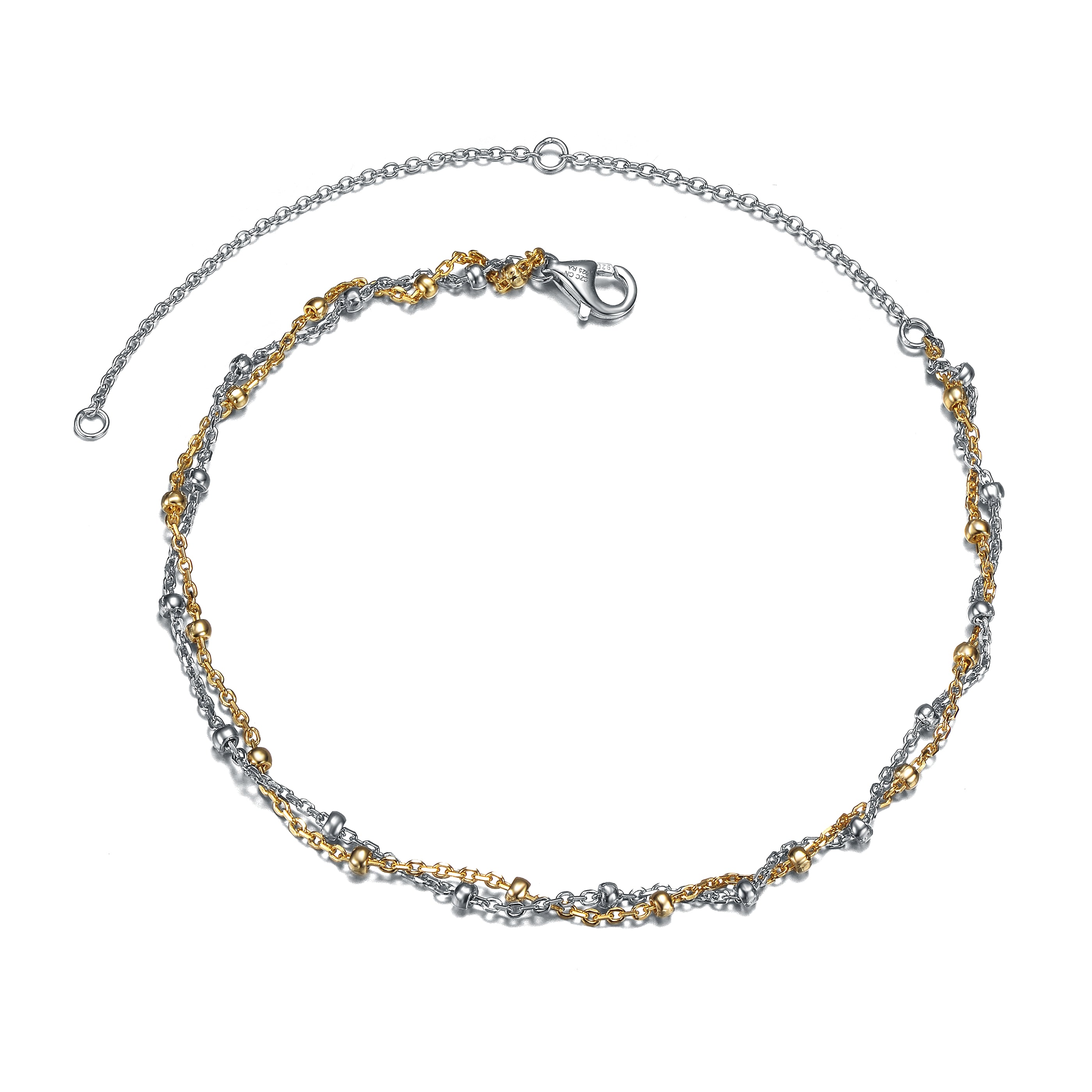 This beautiful sterling silver rhodium plated double-layer anklet exudes an Indian cultural influence with its gorgeous interplay of two delicate, slightly twisted rolo cable chain strands. Shiny 14k gold plated bead-ball accents highlight the details of this must-have anklet for those who love a two-tone style, making it the ultimate go-to for your summer wardrobe and beyond. A lobster clasp and extension chain keep it secure at your chosen length. Anklet measures: 7"" with 1.25"" +2” extension.