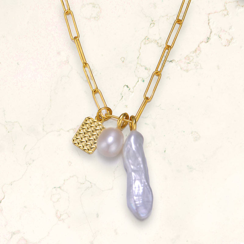 Stylish Sterling Silver 14K Gold Plated Freshwater Pearl and Cubic Zirconia Chain Necklace . This stylish item features interesting design made out of gauge wire chain accented with one long, one round Freshwater pearl and square shaped hammered charm. Crafted of Sterling Silver with 14K Gold Plating and it is secured with spring ring closure. Perfect piece of jewelry for stylish combinations. This item also makes a sensational gift.
