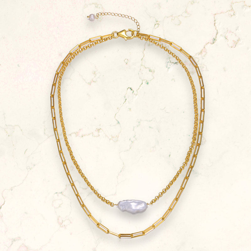 Elegant Sterling Silver 14K Gold Plated Freshwater Pearl Layered Necklace . This stylish item features interesting layered design made out of two layers. The first one is rolo chain decorated with long Freshwater pearl in the center and the second is gauge wire chain. Crafted of Sterling Silver with 14K Gold Plating and it is secured with lobster claw. Perfect piece of jewelry for stylish combinations. This item also makes a sensational gift.