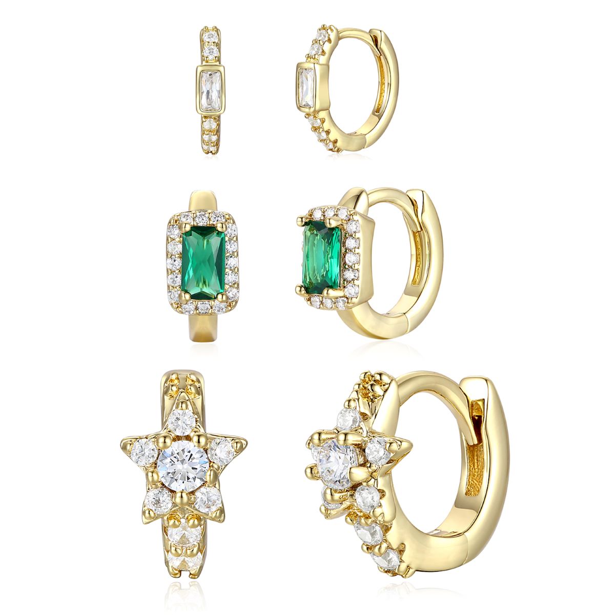 Mix and match these different fashionable looks! Add this versatile 3-piece hoop earrings set to your Ear Party look, featuring emerald-like and -like cubic zirconias in various trendy cluster designs. Hinged backs keep these pretty hoops secure, all crafted from sterling silver with 14k gold plating.