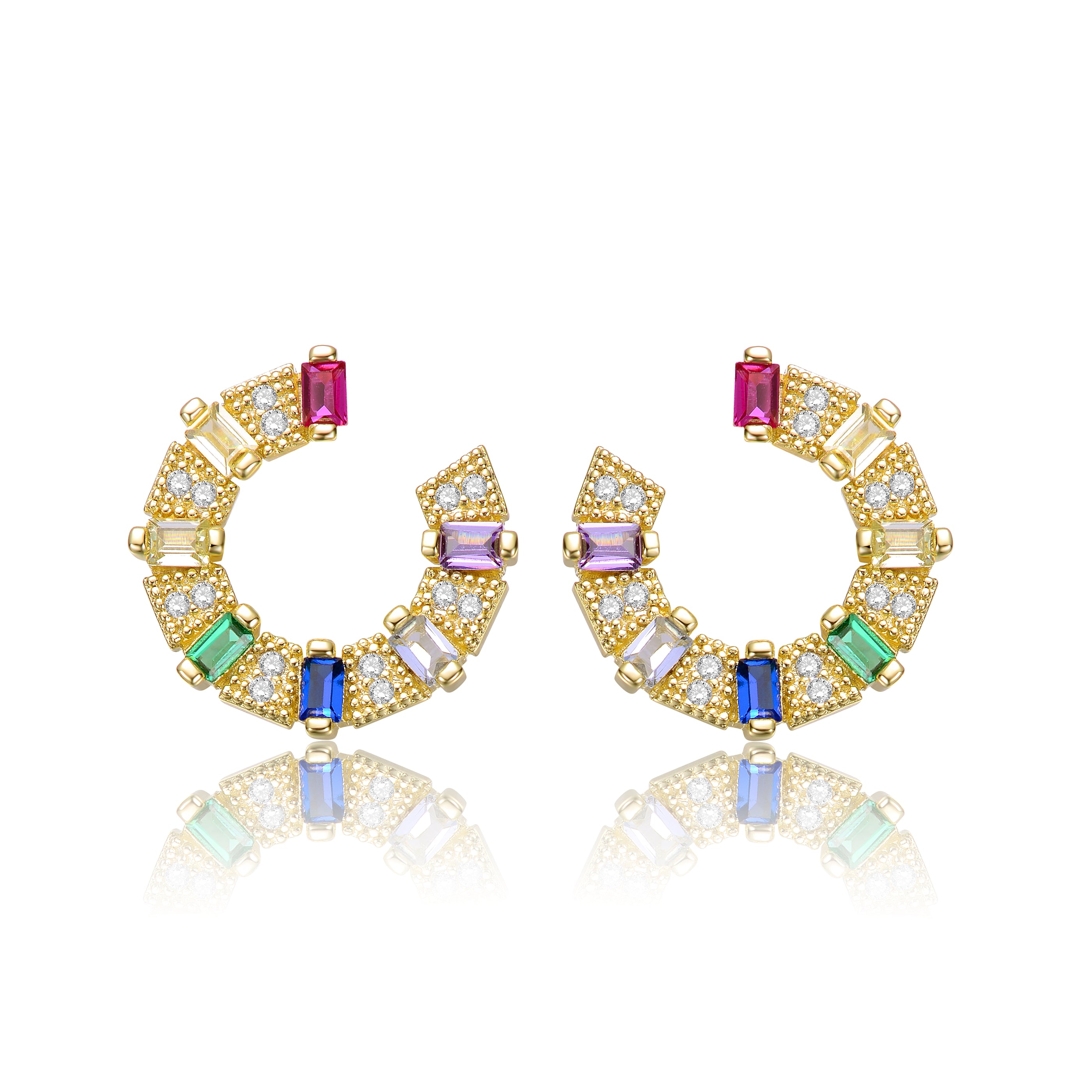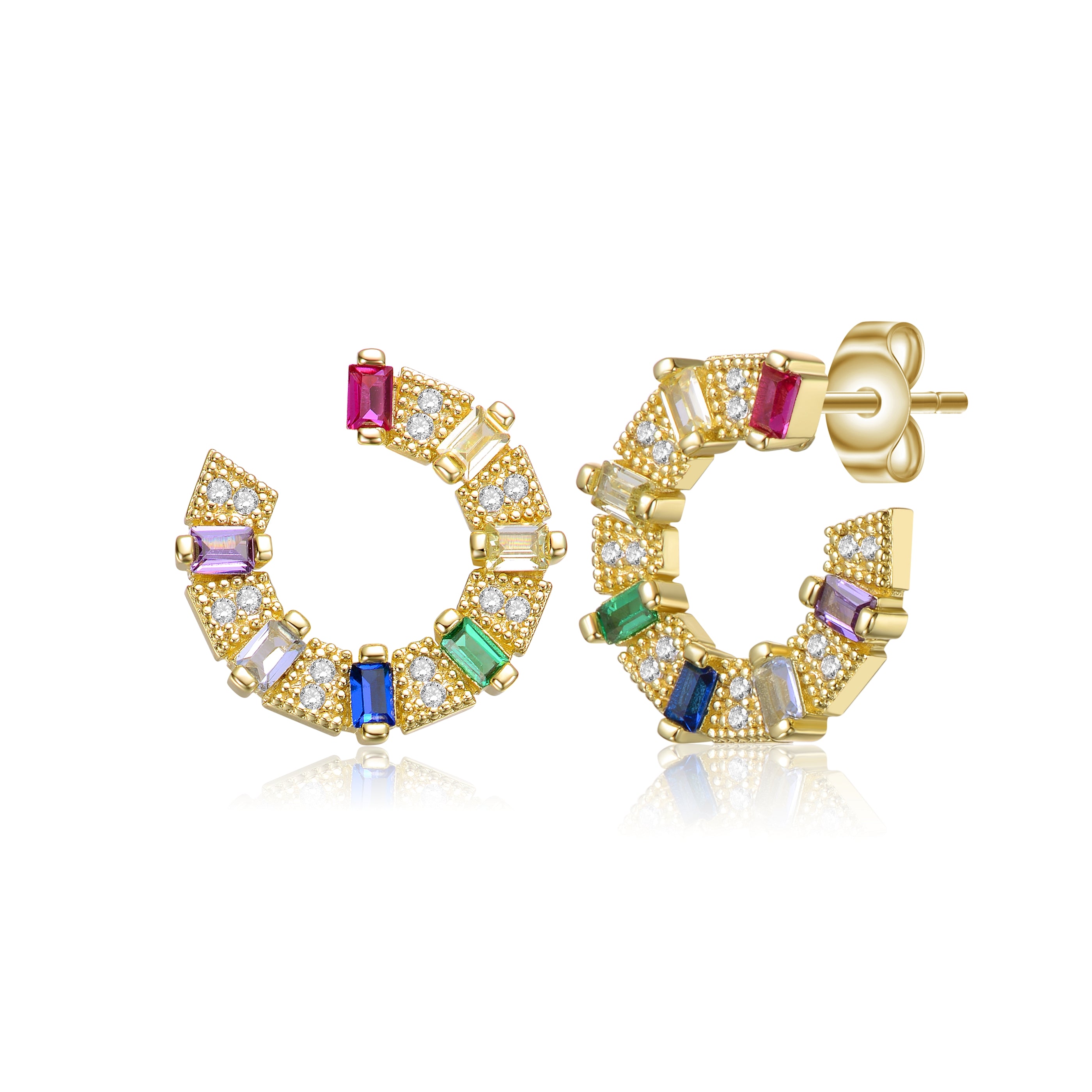 Sterling Silver 14k Gold Plated Rainbow & White Cubic Zirconia Front-Facing C-Hoop Earrings. Elevate your wardrobe to the next level of modern style with these brightly polished sterling silver gold plated front-facing earrings. The classic hoop earrings gets a "pivot" as these earrings sit on the front earlobes only. The rainbow baguette and white cubic zirconias set in a stunning interplay of color, giving them a luxurious design. Butterfly backs keep these little earrings secure.