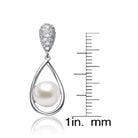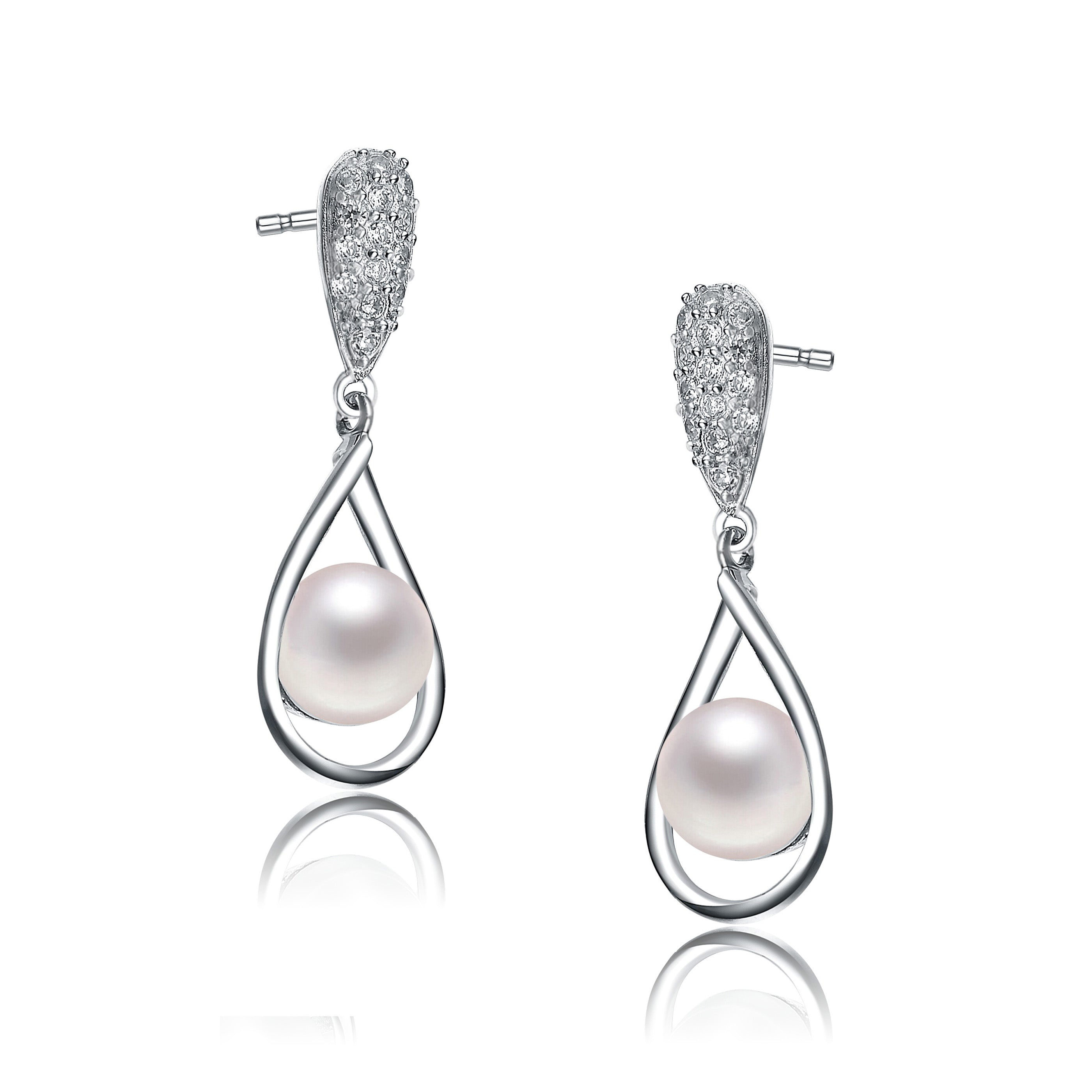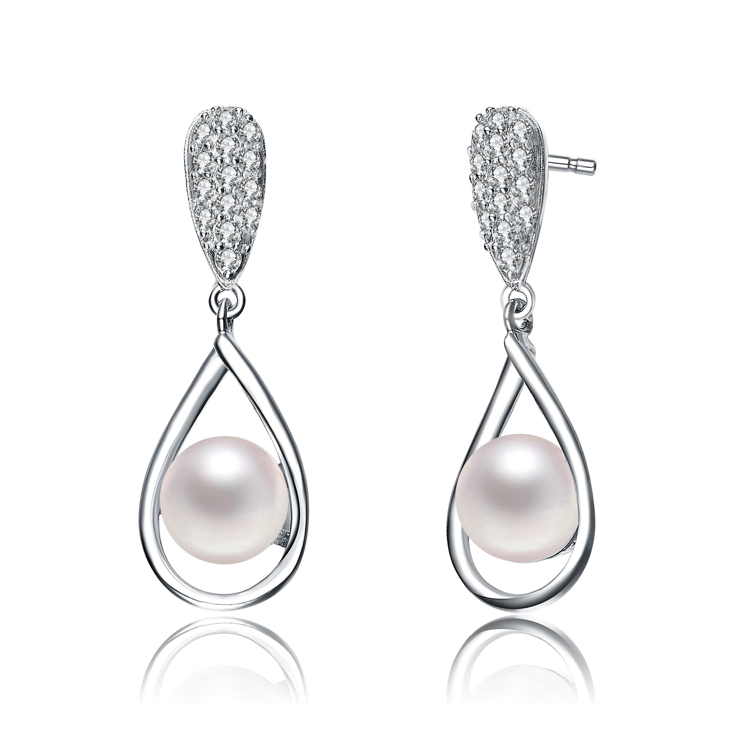 These elegant dangling earrings feature white pearls set in outlined pear-shapes enhanced with round-cut cubic zirconia stones. Crafted of sterling silver with 14K Gold Plating, these earrings secure with butterfly clasps. Available in Rhodium plating as well.