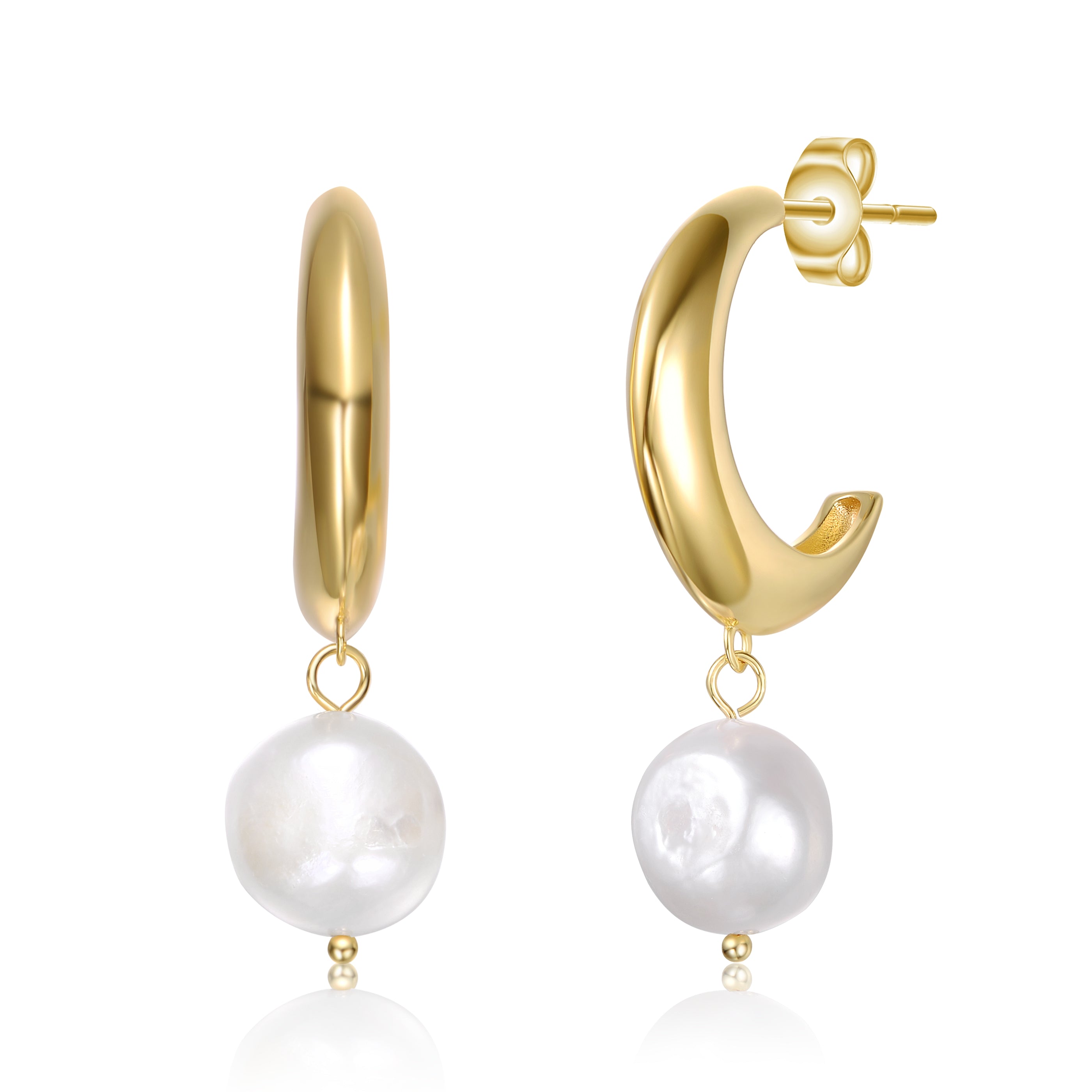 Discover refined elegance with these high-quality Sterling Silver Dangle Earrings, beautifully enhanced with 14K gold plating. The top part of the earrings showcases a chic gold open half-hoop in a moon shape, secured with a butterfly closure. Gracefully dangling below is a pristine 9*12mm freshwater pearl, adding a touch of timeless beauty. These earrings seamlessly blend classic and contemporary design elements, making them a standout addition to any jewelry collection.