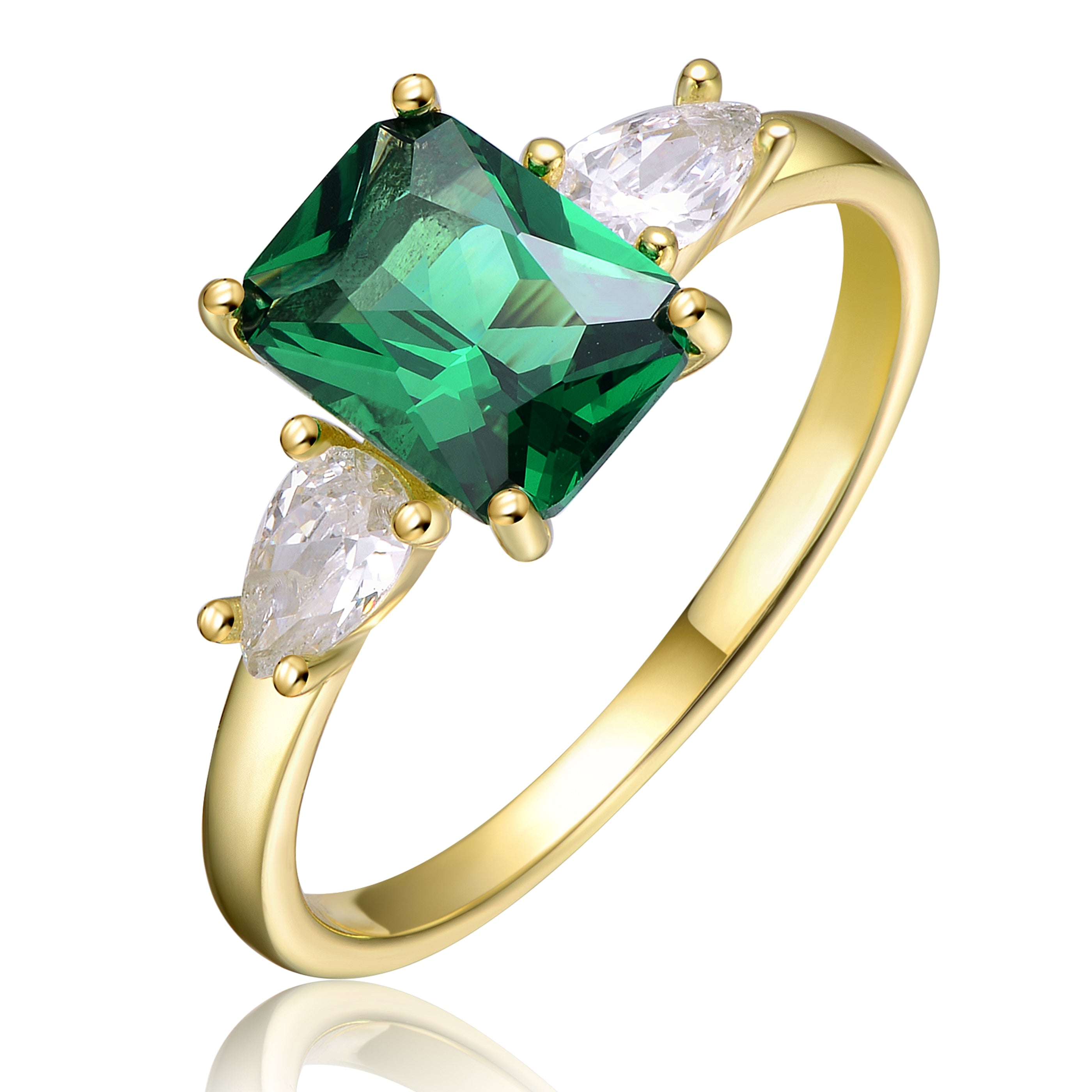 Sterling Silver 14k Yellow Gold Plated with Emerald & Cubic Zirconia 3-Stone Engagement Anniversary Ring. Honor your love and romance with this stunning sterling silver 14k yellow gold plated three-stone ring, representing the past, present, and future of time spent together. An emerald-cut green emerald-like cubic zirconia nestles in a four-prong setting. Sparkling pear -like cubic zirconias secured in four-prong settings on each side add an intriguing mix of shapes, all atop a shiny, slim band. Available in size 6,7, and 8.