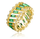 Sterling Silver 14k Yellow Gold Plated with Emerald & Baguette Eternity Band Ring. Make a statement in lavish style wearing this sterling silver 14k yellow gold plated eternity ring. Baguette cut vibrant green emerald-like cubic zirconias secured in channel bar settings accent the ring's interior. Bezel set sparkling round brilliant cut -like cubic zirconias frame the sides of this ring, giving it a contemporary style. Airy, open spaces throughout this decadent design reveal the finger. Available in size 6,7, and 8.