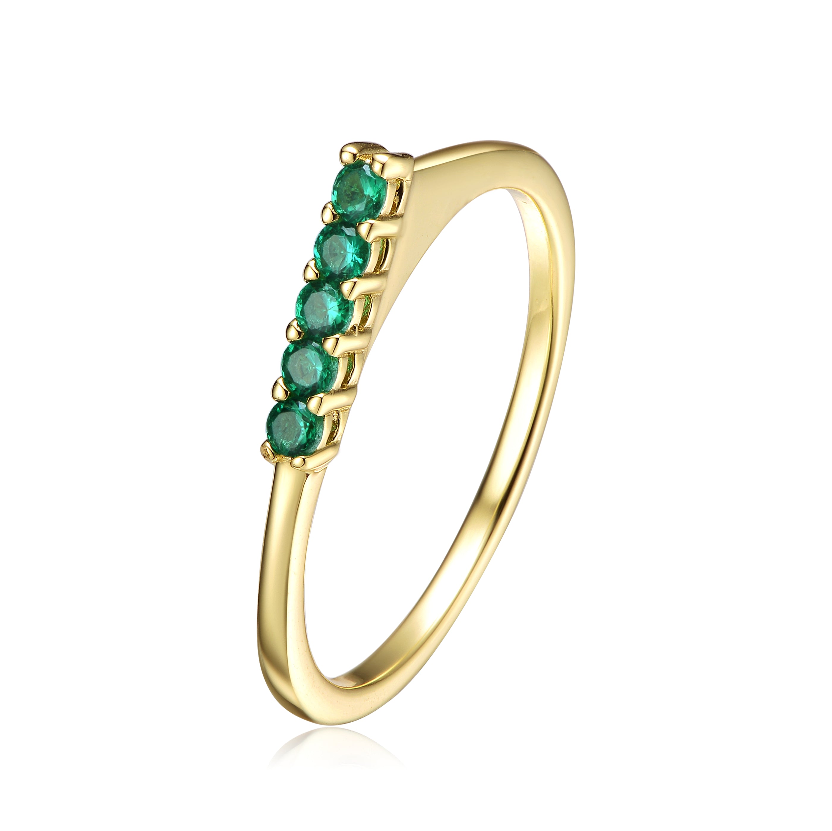 A vibrant, eye-catching design, perfect for your modern lifestyle. This brightly polished 14k yellow gold plated sterling silver ring features a row of emerald-like cubic zirconias prong set on the top in a tapered chevron shape. Wear this stacking ring anytime, pair it with other rings, or wear it solo. Available in sizes 6,7,8.