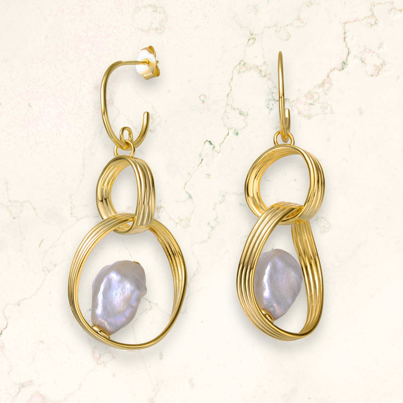 Sterling Silver 14k Yellow Gold Plated with Baroque White Pearl Double Drop Half-Hoop Dangle Earrings. Celebrate your next special occasion by gifting your beloved these 14k yellow gold plated sterling silver earrings, perfect for a birthday (June birthstone), anniversary, holiday, or surprise. Shimmering white baroque pearls add a boho-chic vibe, artfully on graduated double drops placed on c-hoops. Butterfly backs keep these shiny dangles secure, making them effortless as your next selection in sophisticated style.