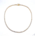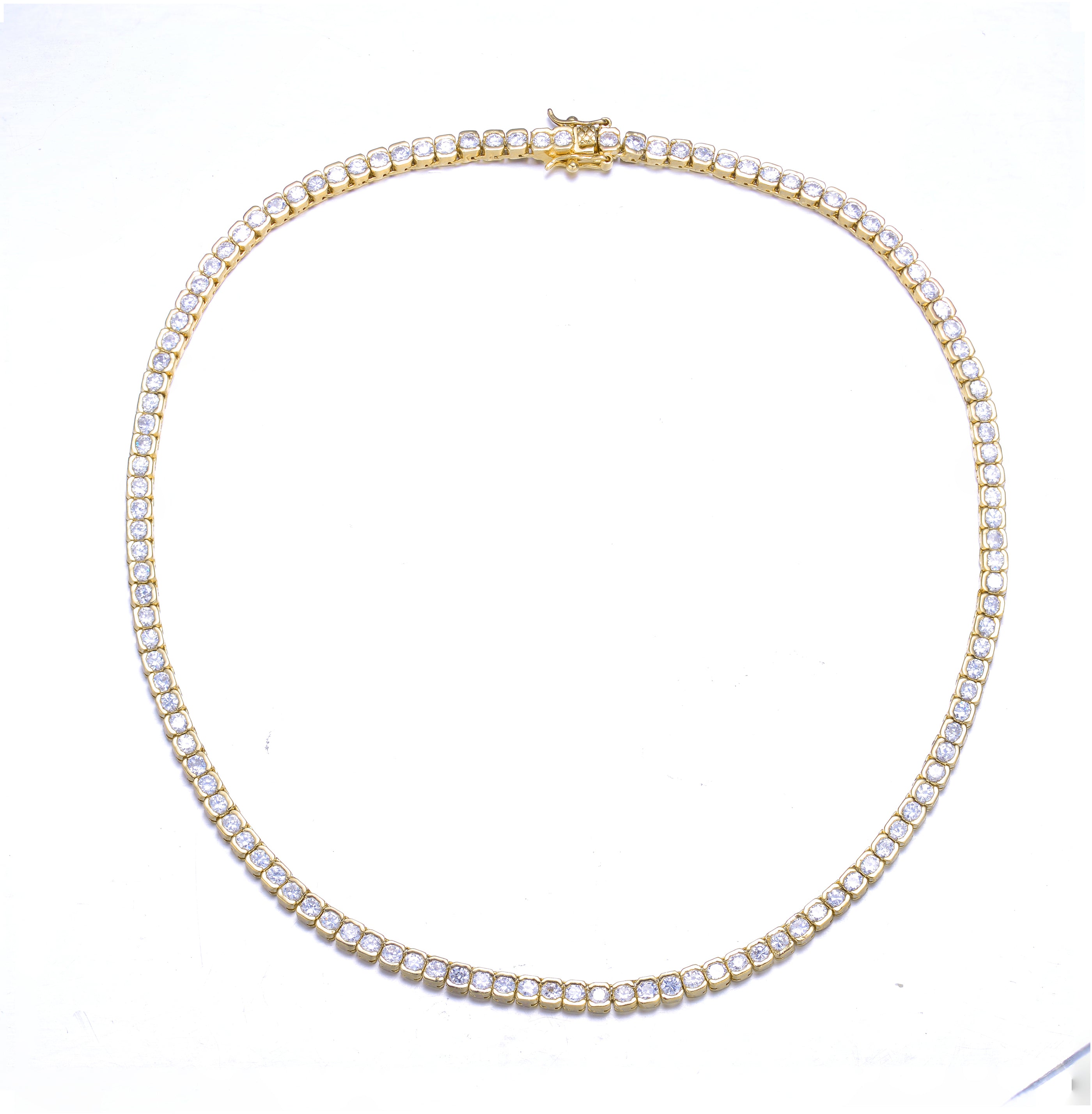 Sterling Silver 14k Yellow Gold Plated with Cubic Zirconia Classic Tennis Chain Anniversary Necklace. This classic tennis chain necklace features a never-ending row of sparkle and luxury! Round brilliant cut cubic zirconias in round basket channel bar links exude timeless sophistication. Layer this pretty necklace with other delicate chains or wear it solo to work, casual or night events. A hidden box clasp and two figure-eight safeties keep this 14k yellow gold plated sterling silver necklace secure.