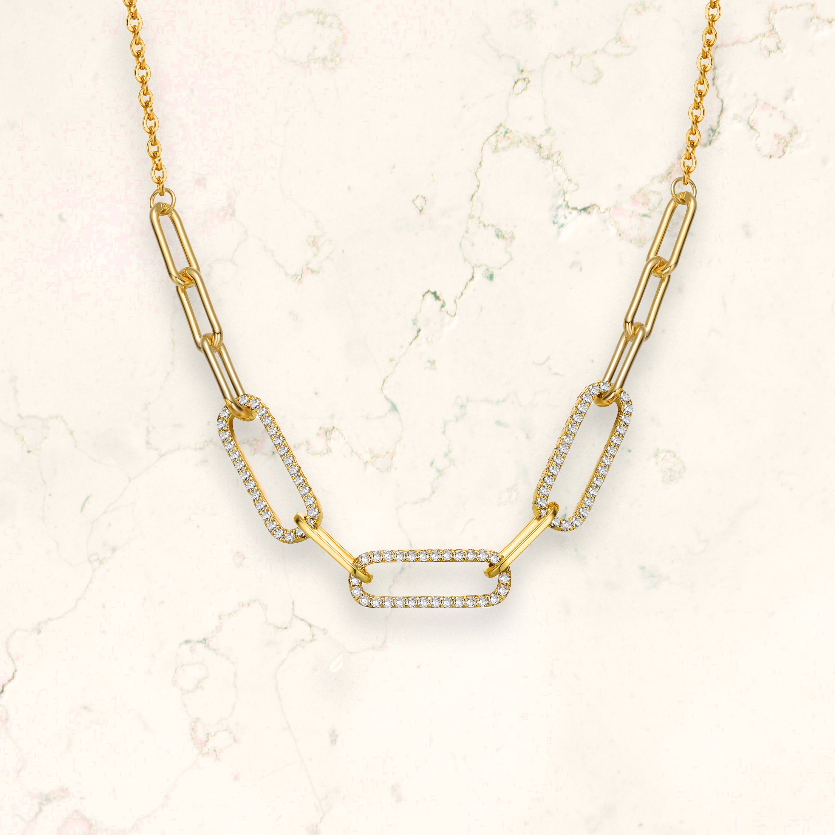 Sterling Silver 14k Yellow Gold Plated with Cubic Zirconia Elongated Cable Link Chain Necklace. Slinky, graduated oval cable links align on this brightly polished 14k yellow gold plated necklace, artistically crafted with attention to detail. Glittering round brilliant cut cubic zirconias French pave set on the front links elevate this trendy necklace to another level of glamor, perfect for wearing with your day or night wardrobe. A secure lobster clasp keeps it secure. Celebrate your next anniversary or special moment by gifting this necklace to any loved one.