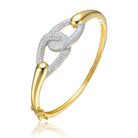 Sterling Silver 14k Yellow Gold Plated with Cubic Zirconia Entwined Double Raindrop Bangle Bracelet. Take your look one step further with this sophisticated sterling silver 14k yellow plated gold bangle bracelet, perfect for adding a glamorous detail. Sparkling round brilliant cut cubic zirconias French pave set on the top double entwined pear link design taper into a slim bangle on the bottom, giving it a dose of elegance mingled with contemporary trends. A hidden box clasp keeps this bangle secure, along with a hinge on the other side for ease of wearability, making it effortless to place on and remove.