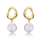 Sterling Silver 14k Yellow Gold Plated with White Coin Pearl Twisted Halo Circle Dangle Drop Earrings. These unique earrings feature shimmering white coin pearls (June birthstone) drill set on the bottom of twisted eternity circle halos, giving this pretty design a double dangle drop style. Butterfly backs keep these stunning earrings securely on the ears, all crafted in brightly polished 14k yellow gold plated sterling silver. Celebrate your next special occasion or birthday (June birthstone) by gifting these sophisticated earrings to any loved one.