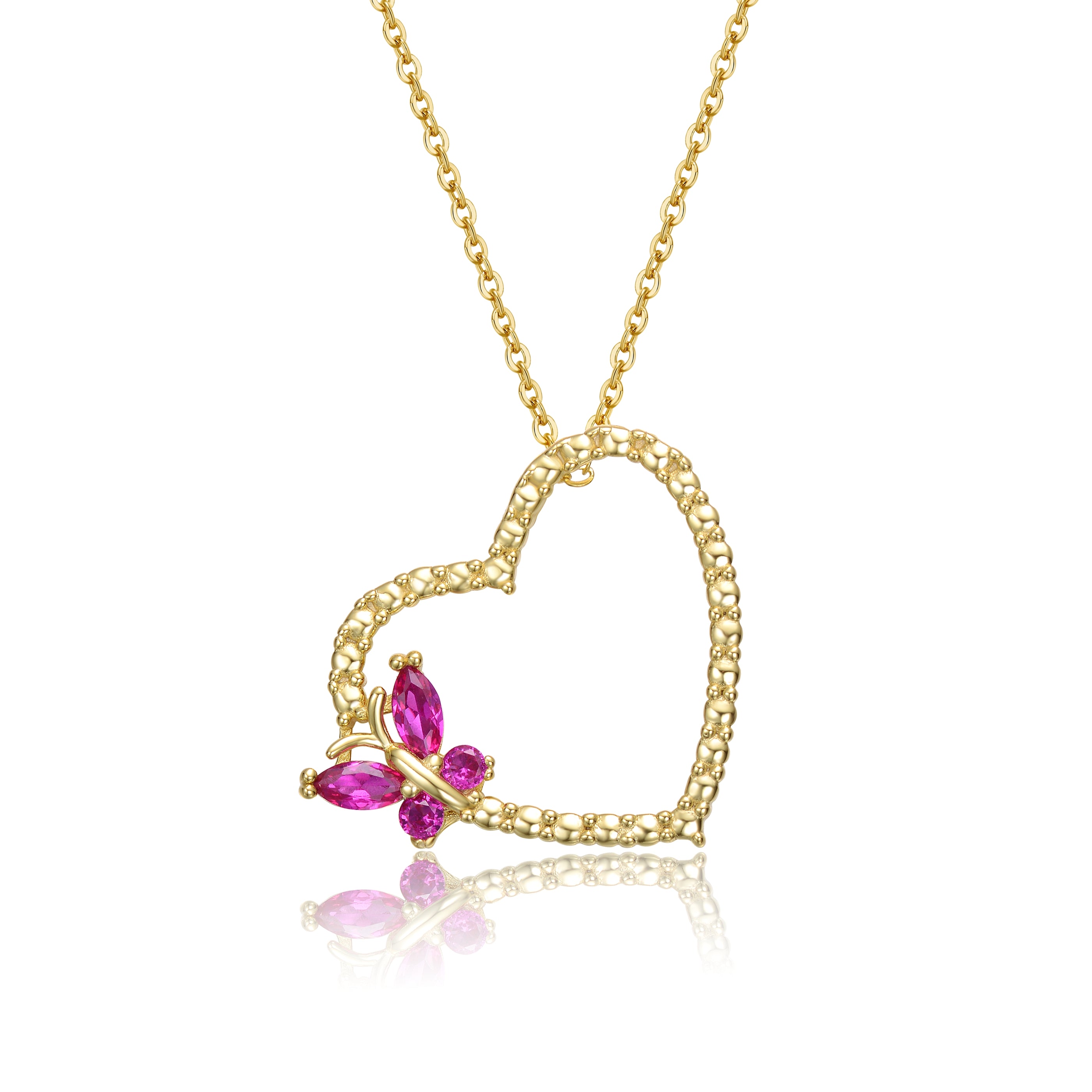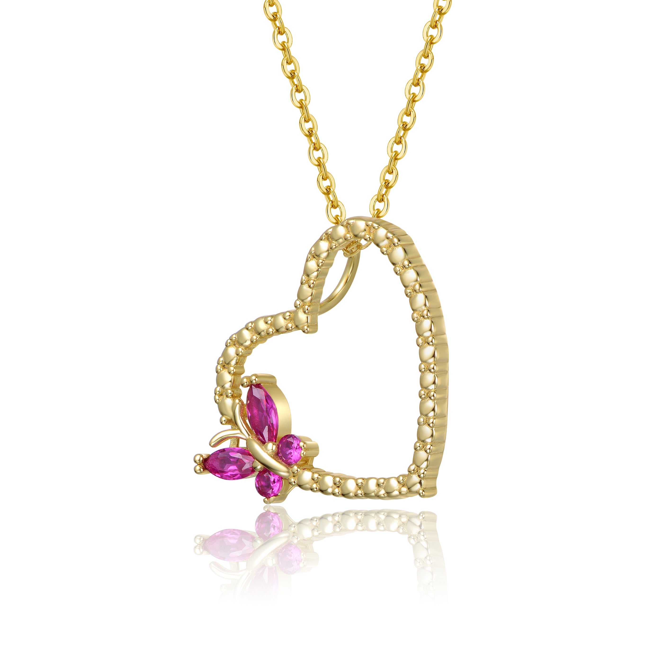 Sterling Silver 14k Yellow Gold Plating with Butterfly Ruby Cubic Zirconia Heart Shaped Pendant Necklace