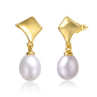 Sterling Silver 14k Yellow Gold with White Pearl Drop Geometric Shield Retro Dangle Earrings. These lavish 14k yellow gold plated sterling silver earrings feature a shimmering oblong white pearls (June birthstone) drill set on the bottom, giving them a look of contemporary sophistication. A shiny square shield shape on top makes these dangles a retro statement touched by abstract artistry. Butterfly backs keep these pearl dangle earrings secure, making them easy to wear, mix and match with other pearl jewelry if desired.