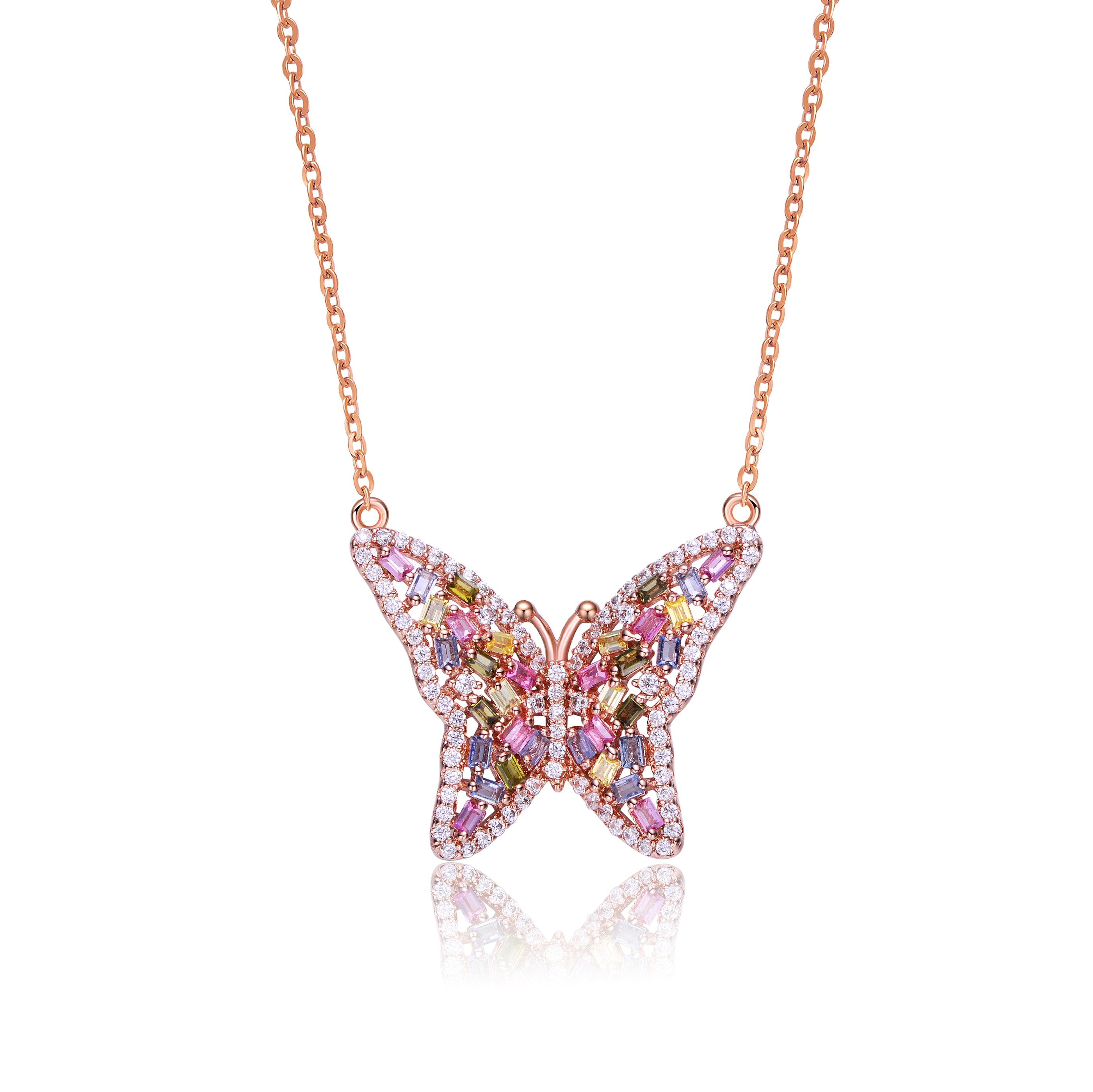 Elegant Sterling Silver with 18K Rose Plated Multi Color Cubic Zirconia Butterfly Necklace. This design features butterfly shape, made out of multi colored pink, blue, green, yellow baguette cubic zirconia stones set in prong on the wings, surrounded by frame paved with clear round cubic zirconia stones. Crafted of Sterling Silver with 18K Rose Gold plating, this long lasting necklace secure with a spring ring closure. Makes a great gift as well.