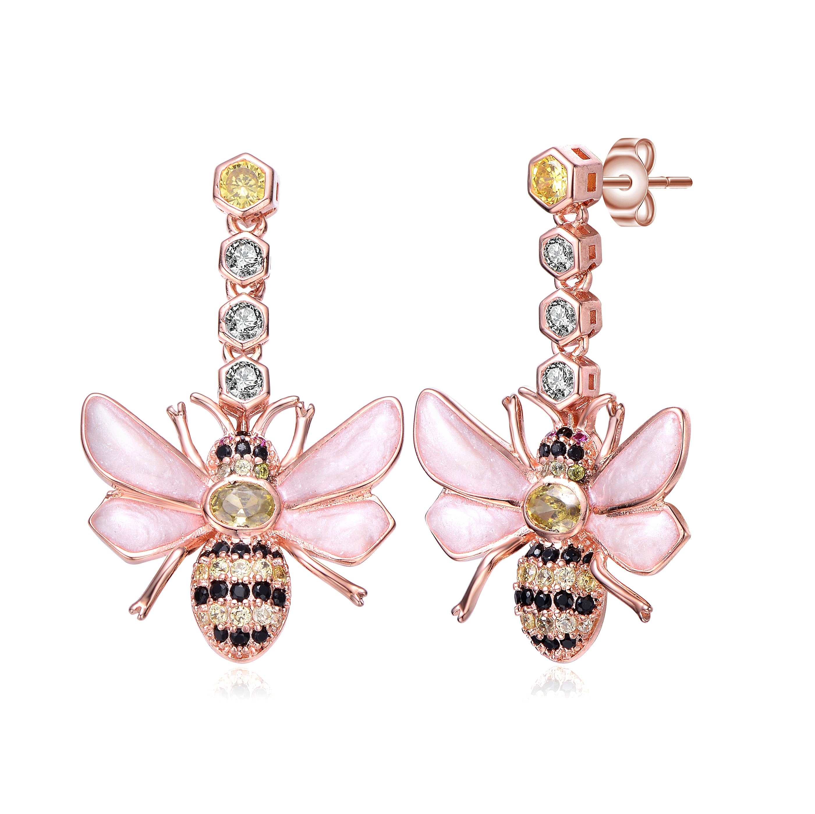 Stylish Sterling Silver 18K Rose Plated Clear Cubic Zirconia Floral Drop Earrings. This pair of earrings features interesting bee design. The upper part features small yellow and small clear round cubic zirconias set in hexagon bezel shape. It continues down where the bee shape is accented with small yellow and black round cubic zirconia stones set in decorative prong setting, and wings accented with white stones. Crafted of Sterling Silver with 18K Rose Plating and it is secured with butterfly closure. Perfect piece of jewelry for stylish combinations. This item also makes a sensational gift.
