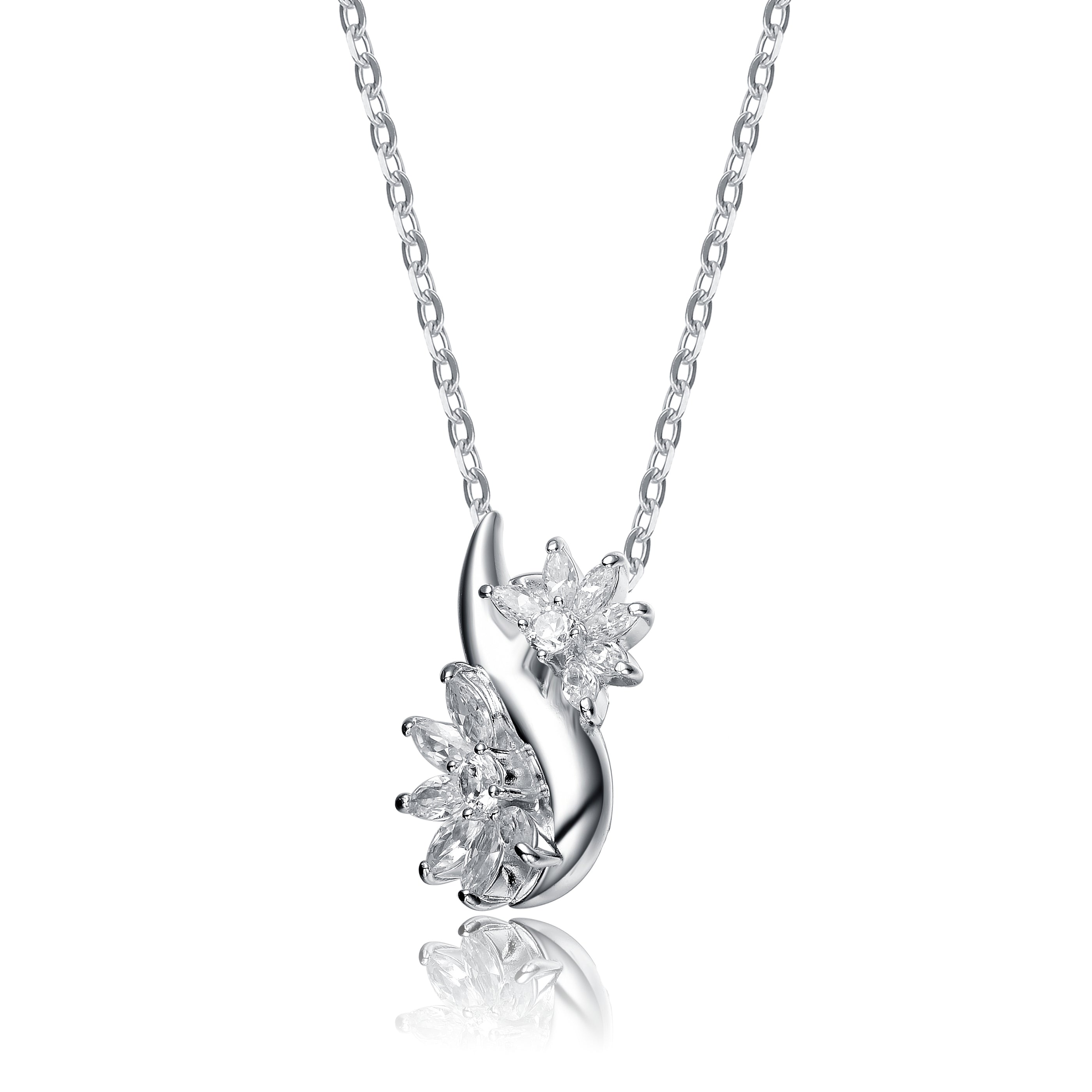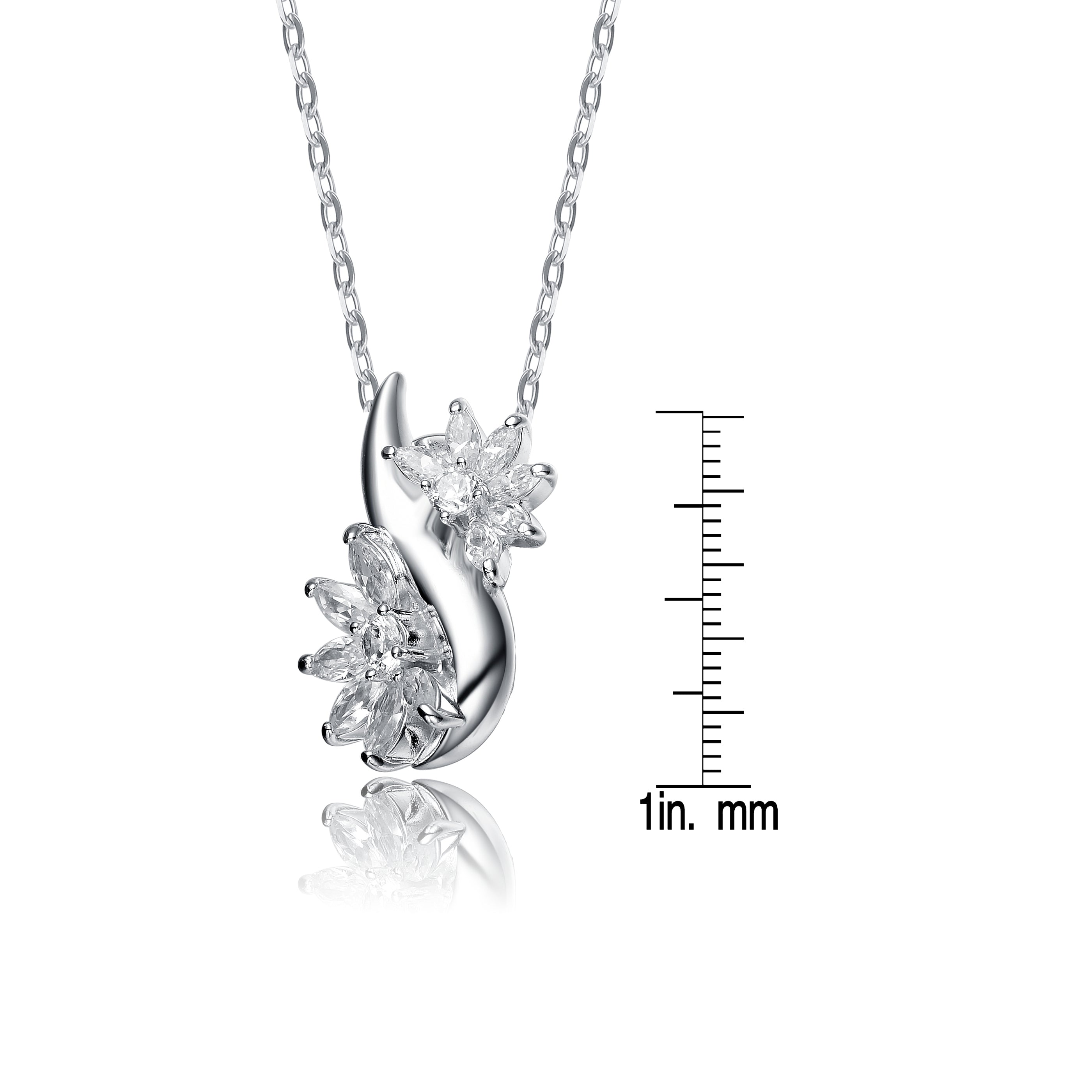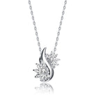 This sophisticated pendant features a unique flame design, crafted from high-quality sterling silver. The pendant is adorned with multiple sparkling cubic zirconia stones, meticulously arranged to capture and reflect light, resembling the dynamic movement of fire. The pendant hangs gracefully from a delicate sterling silver chain, making it an eye-catching piece of jewelry suitable for various occasions. Its blend of elegance and modern design makes this pendant an interesting choice for those seeking to add a touch of glamour to their ensemble.