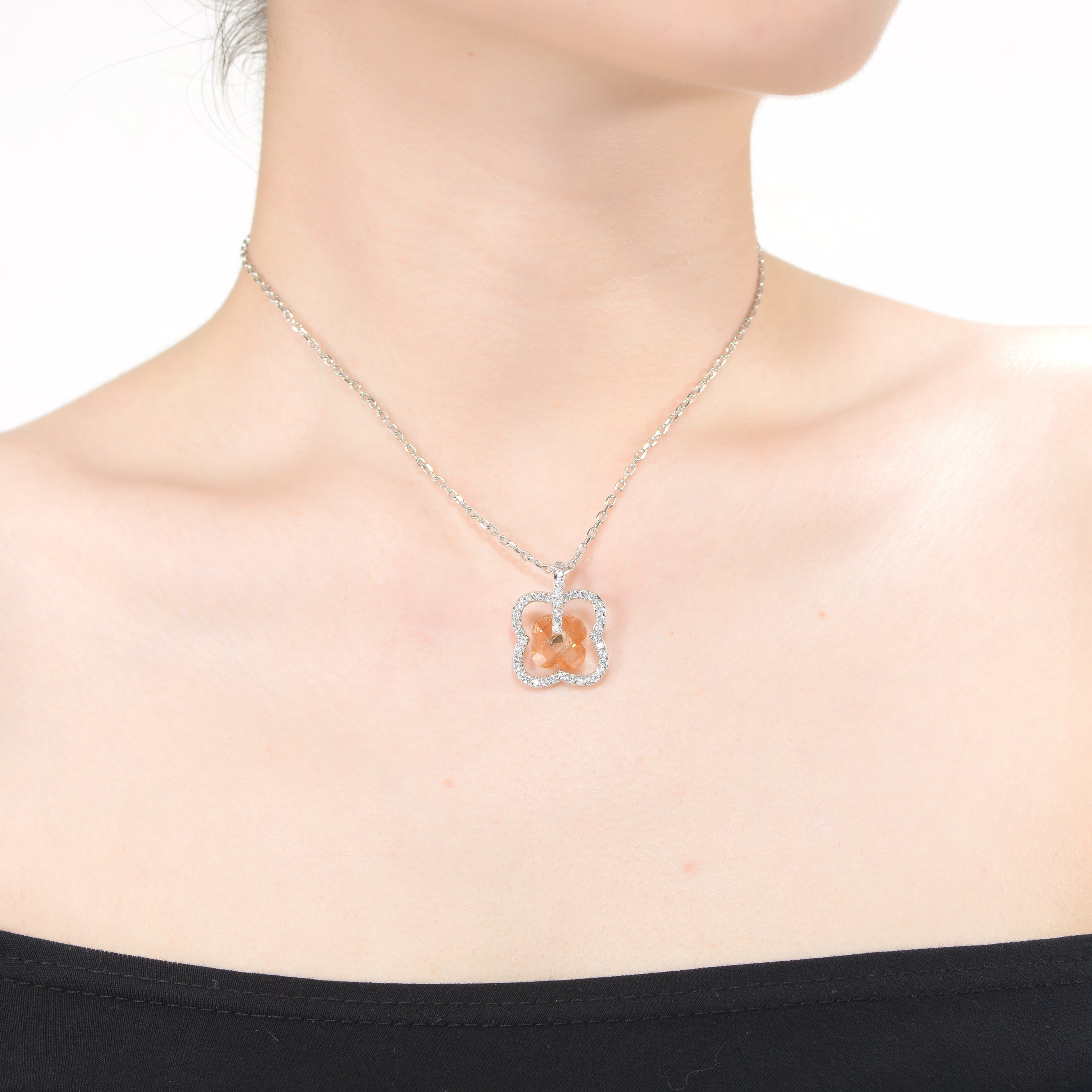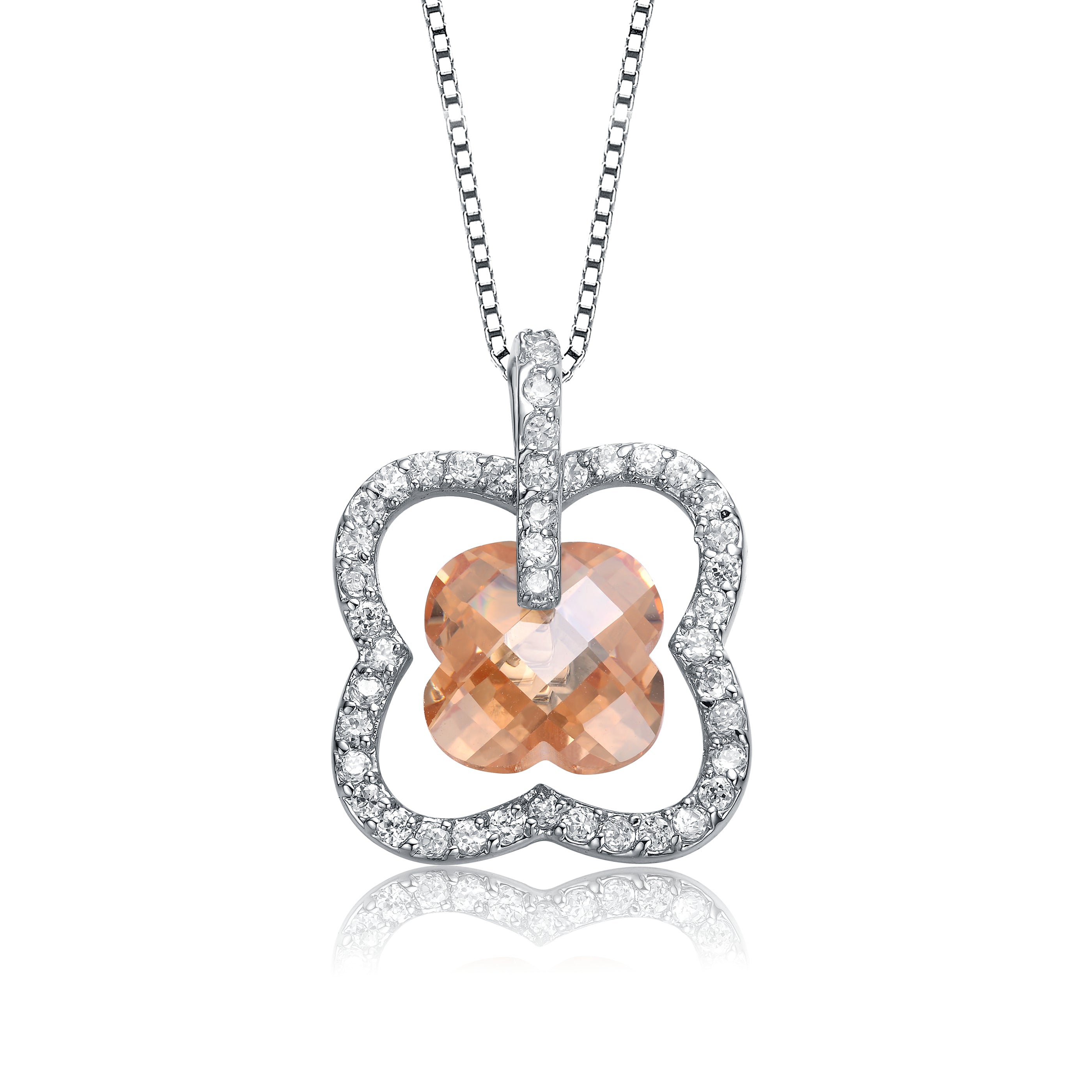 This sophisticated pendant features a flower design, crafted from sterling silver and adorned with sparkling cubic zirconia stones that line the petals. At the center of the flower is a large, peach-colored cubic zirconia stone, cut in a faceted style to enhance its brilliance and catch the light from every angle. The pendant is suspended on a delicate sterling silver chain, making it an exquisite piece of jewelry suitable for various occasions. Its timeless elegance and radiant finish make it a captivating choice for jewelry enthusiasts.