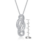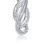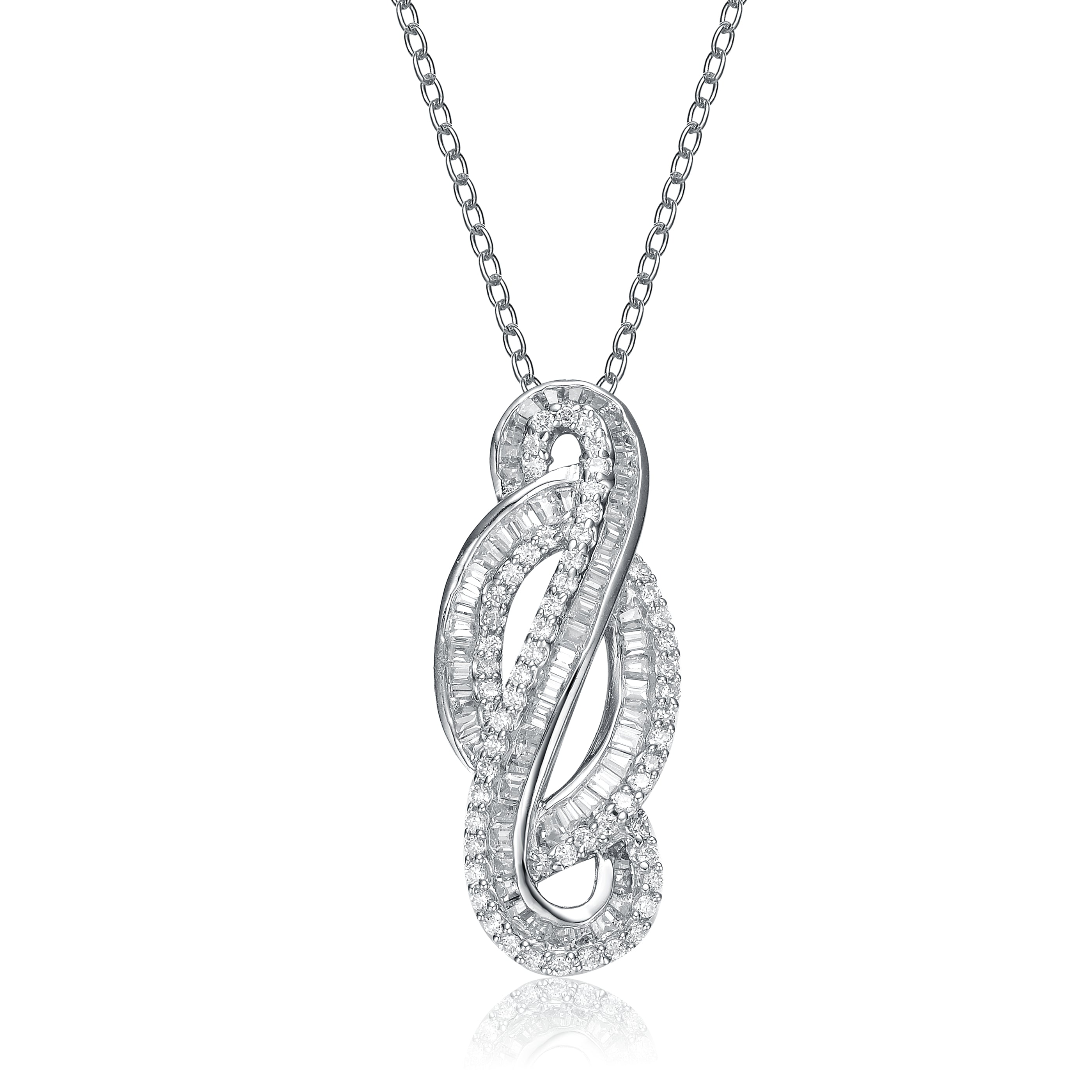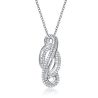 Closely resembling an infinity loop, this necklace is a perfect play between mystery and elegance.The white cubic zirconia inset in Sterling Silver shimmers in the light and hangs from a delicate Sterling Silver chain.