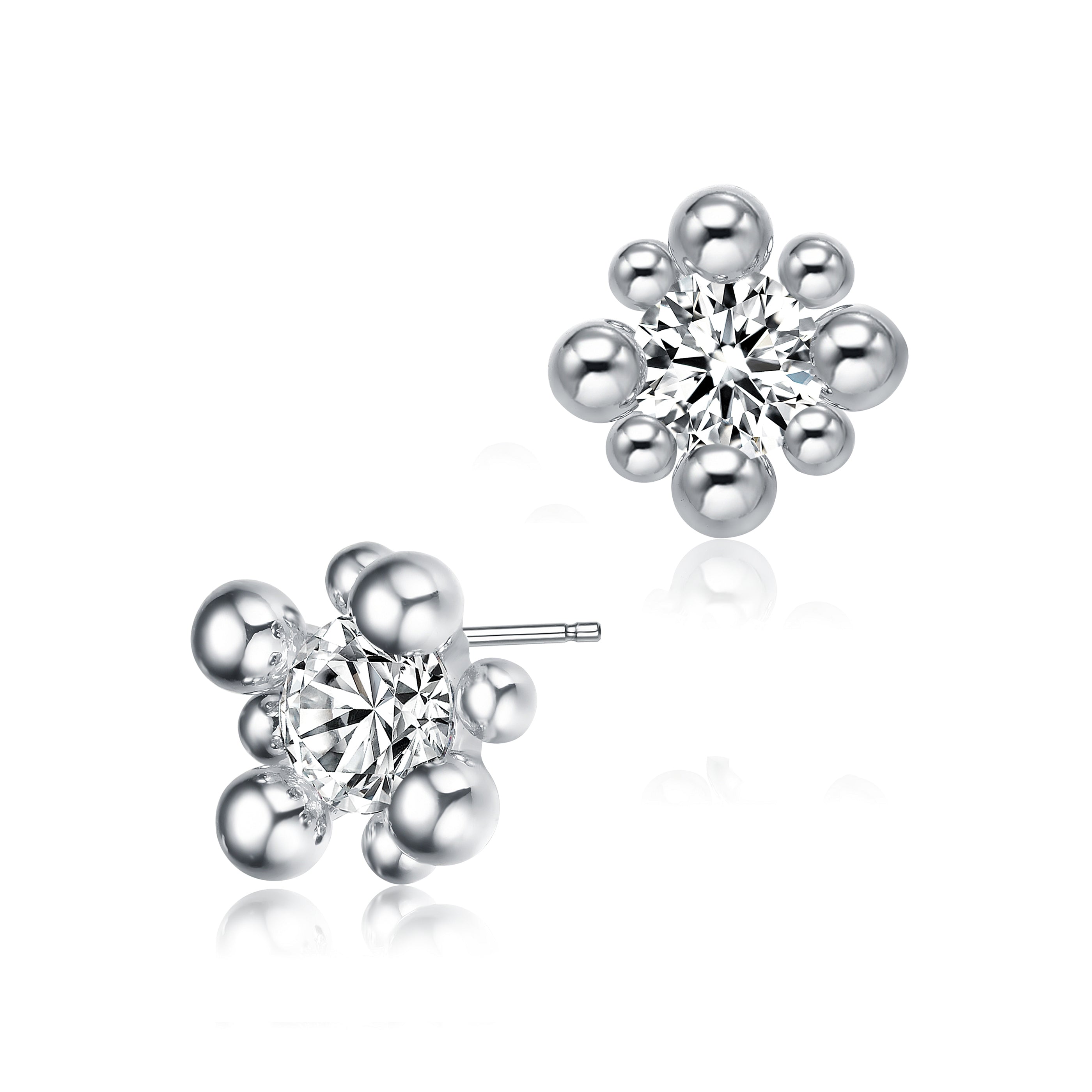 Beautifully crafted Sterling silver with Rhodium plated earrings that is perfect for everyday wear. It features an intricate and unique design composed of clear round Cubic Zirconia haloed with several Sterling silver with Rhodium plated balls. These stud earrings are secured with butterfly clasp.