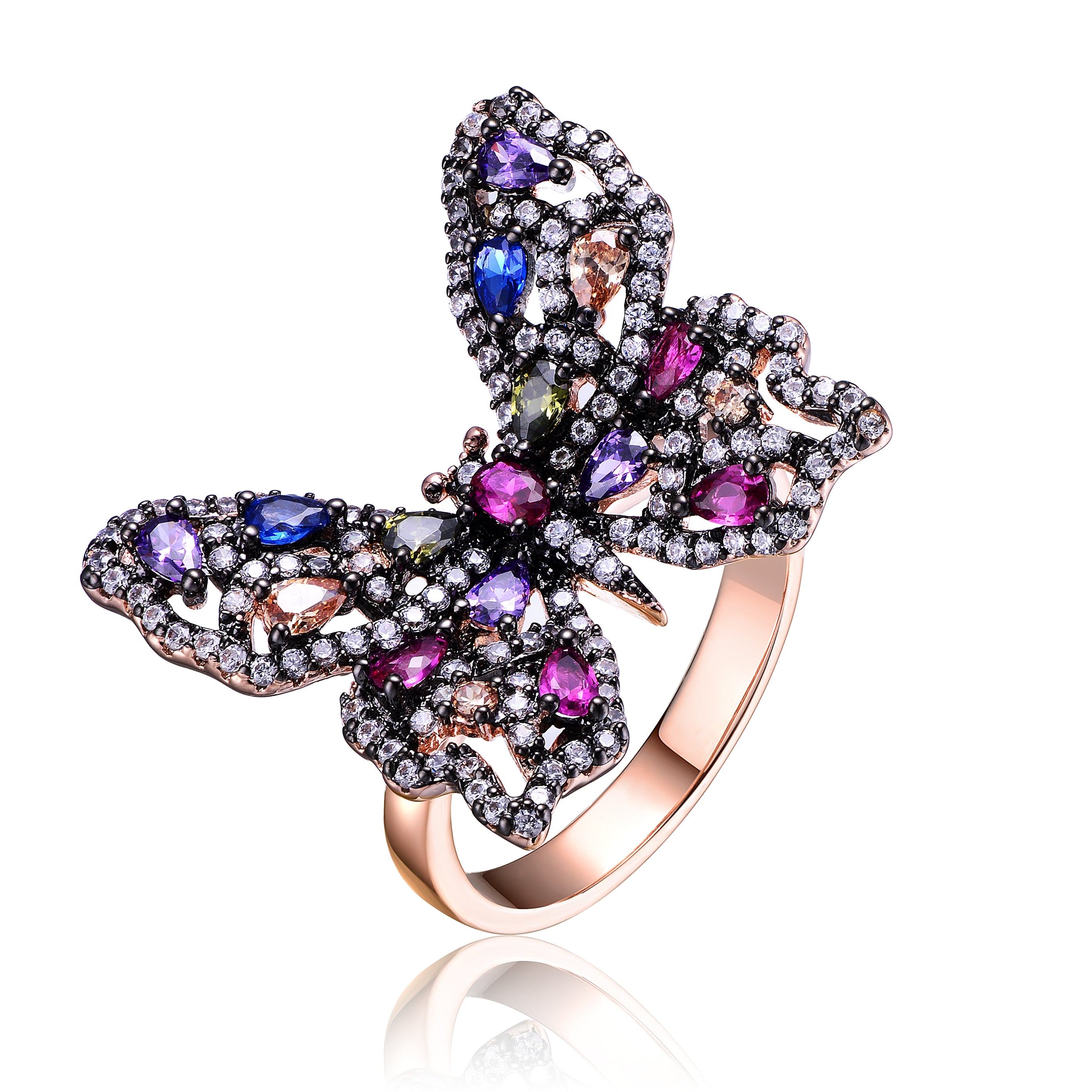 Stylish Sterling Silver with Black and Rose Gold Plated Multi Color Cubic Zirconia Butterfly Ring. This beautiful ring features black plated butterfly shape with large oval multi colored cubic zirconia stones in the center, accented with small clear round cubic zirconia stones paved on the frame. Crafted of Sterling Silver with Black and Rose Gold Plating and it is available in sizes 6, 7 or 8. This item also makes a sensational gift for a special birthday or occasion.