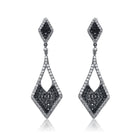 Stylish .925 Sterling silver black plated cubic zirconia drop earrings. These fancy dangling earrings are decorated with black and clear round cut cubic zirconia stones in prong setting. Crafted of .925 Sterling silver in White Gold and black plating and secure with butterfly clasps.