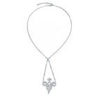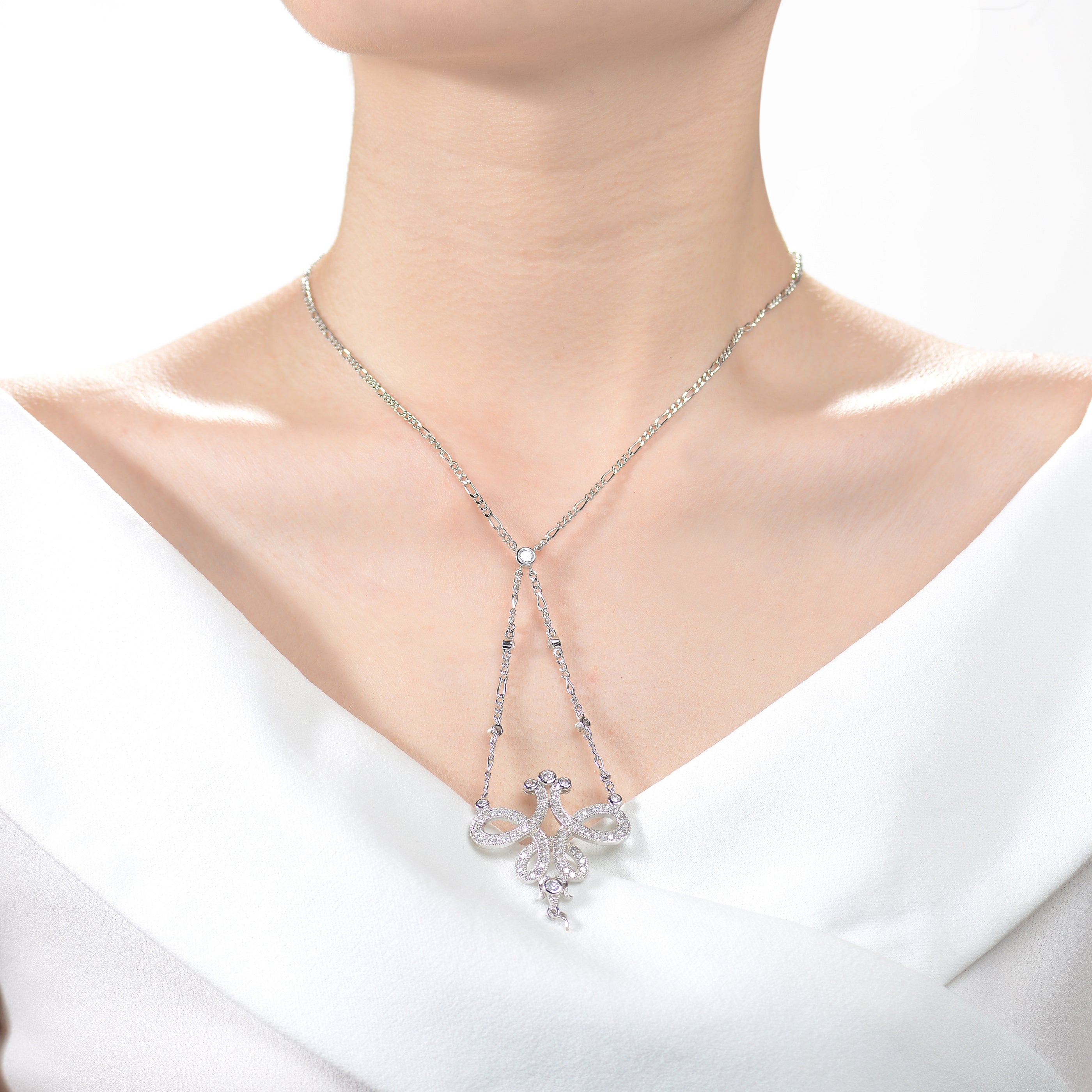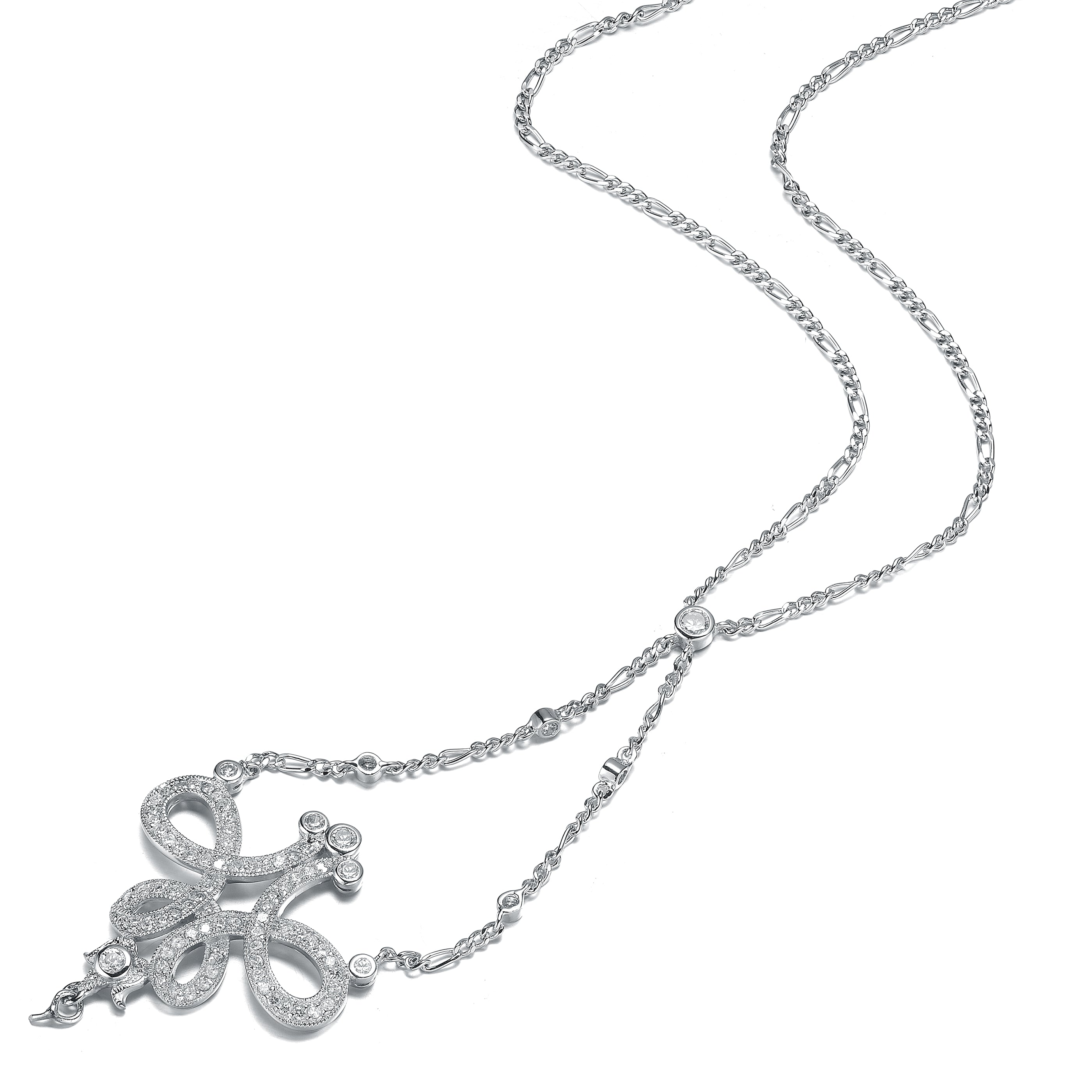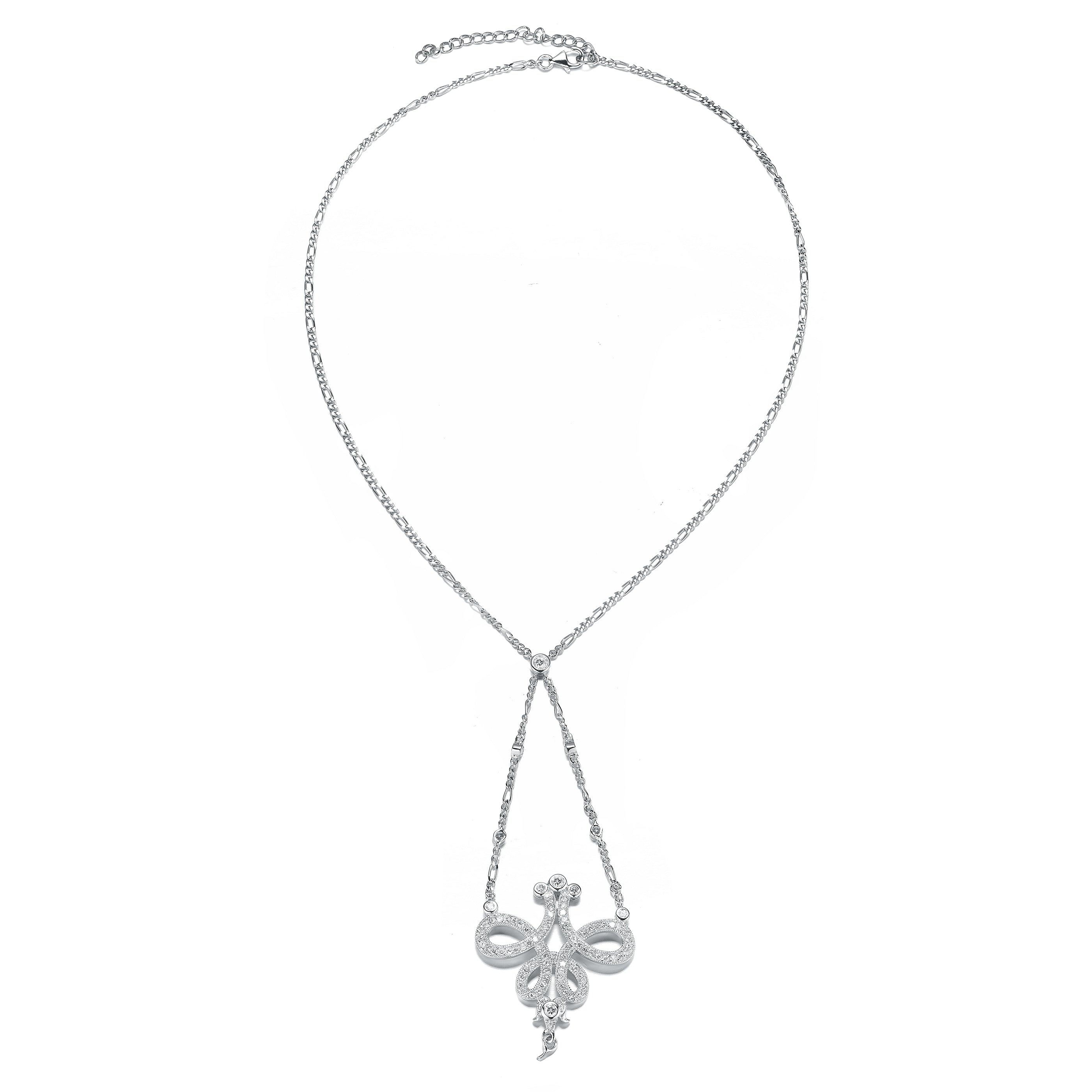 This sterling silver necklace is absolutely fit for a queen. It features an ornate pattern with clear and blue cubic zirconia stones.