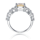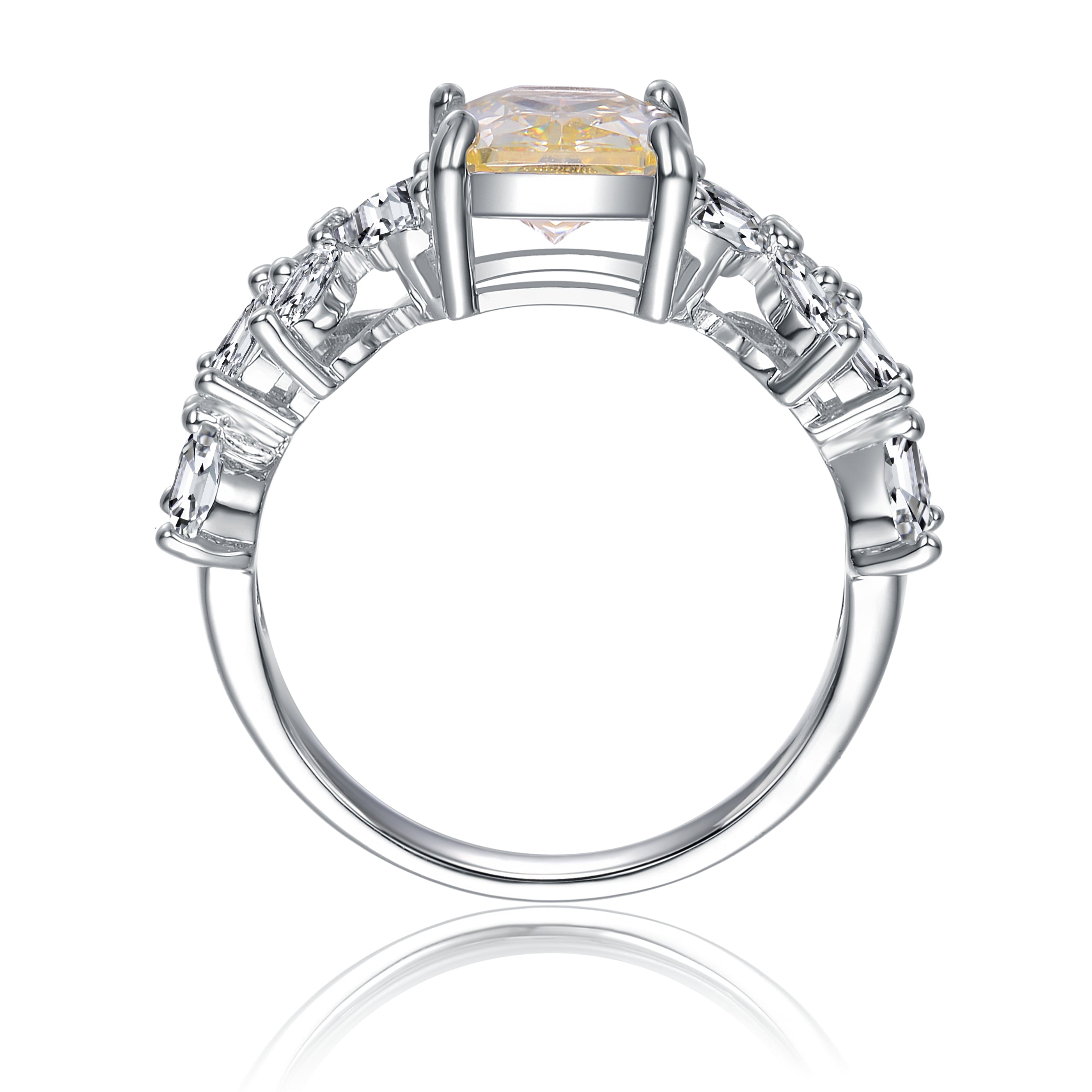 Sterling Silver Canary Yellow & White Cubic Zirconia Radiant Leaf Trellis Cluster Engagement Ring. Celebrate your next special occasion with this brightly polished sterling silver ring, perfect for wearing as an engagement ring or just because with its uniquely elegant design. A radiant cut canary yellow cubic zirconia secured in a four-prong setting in the center is complemented by white cubic zirconia prong set in a trellis leaf cluster on each side. A slim band finishes the look. Ring is available in sizes 6, 7, 8.
