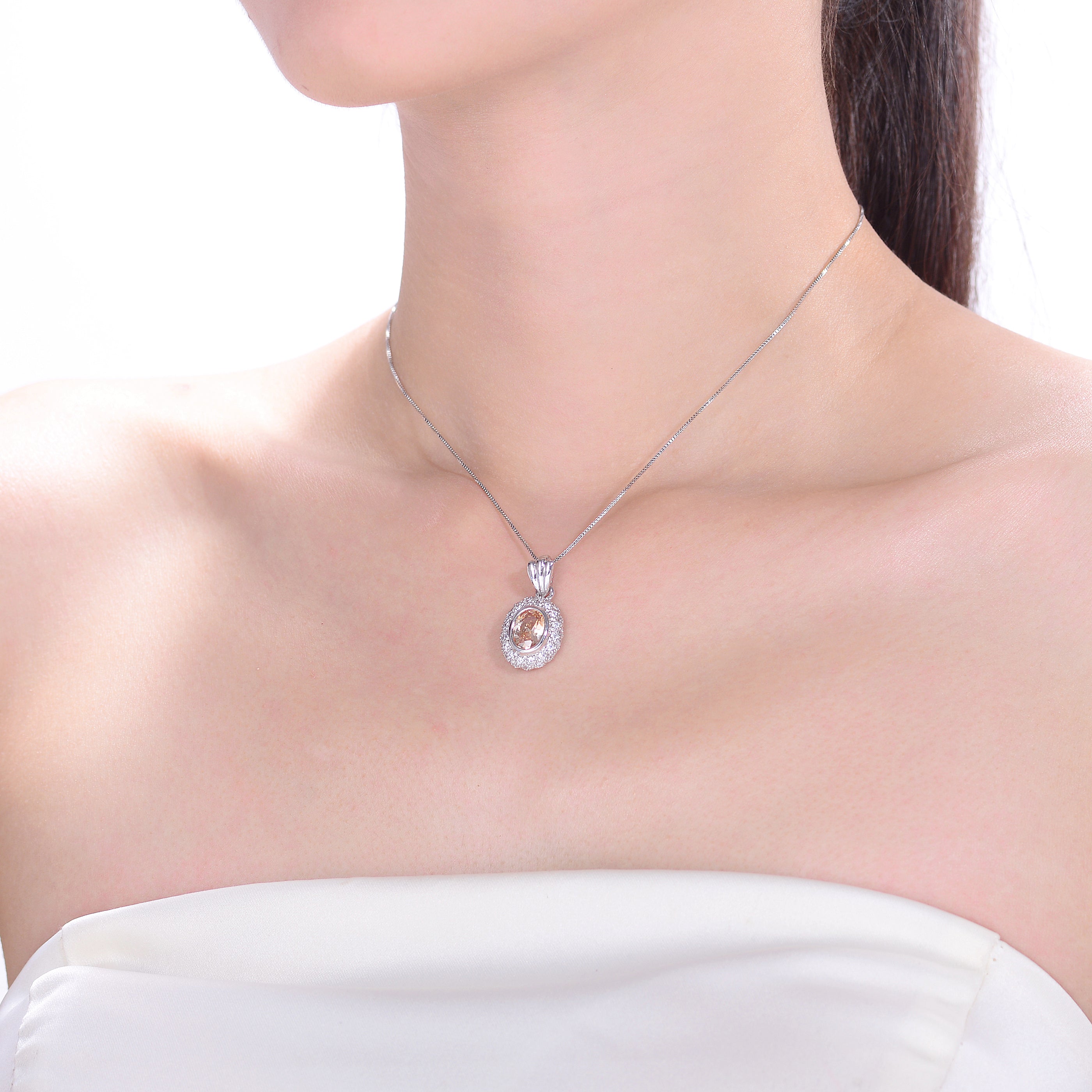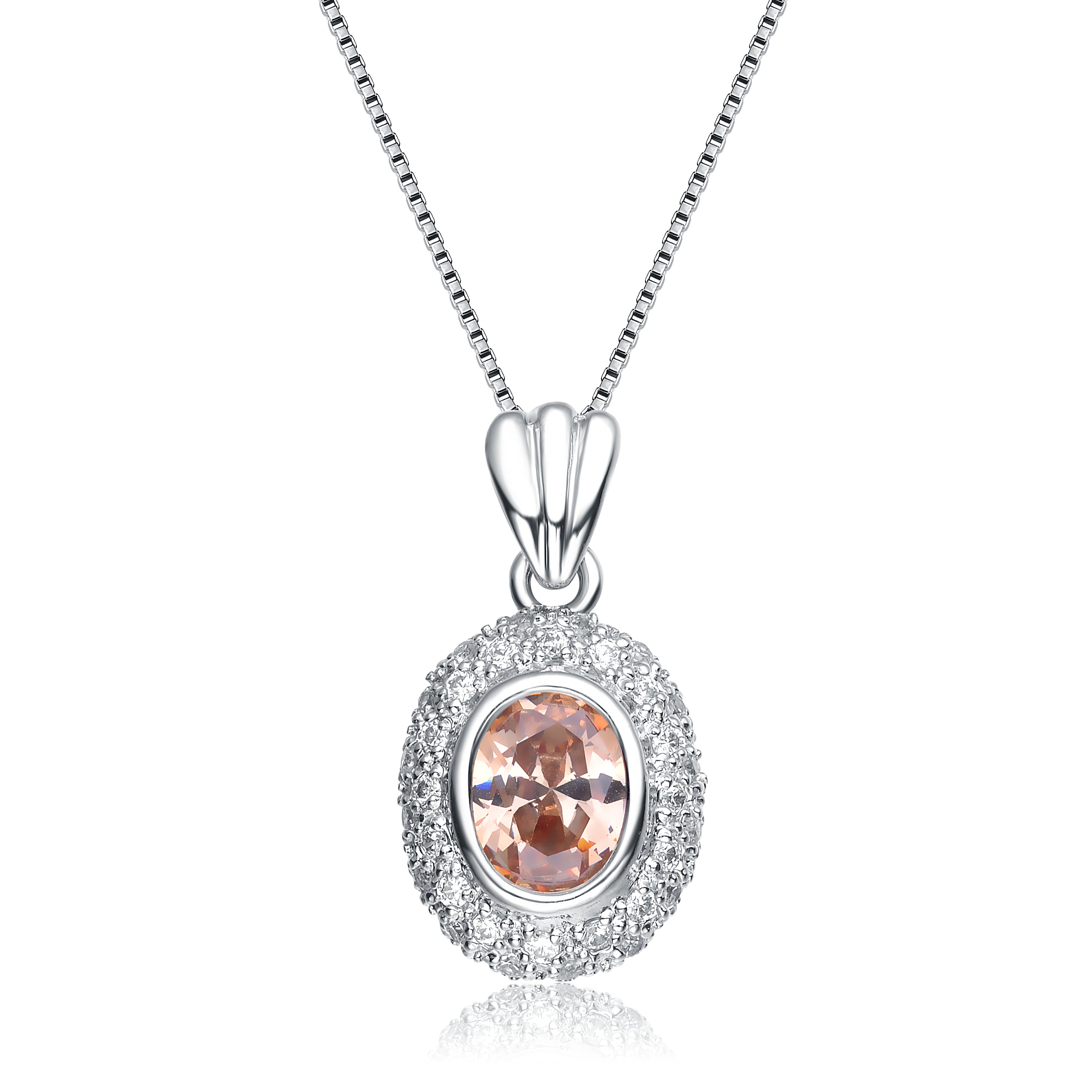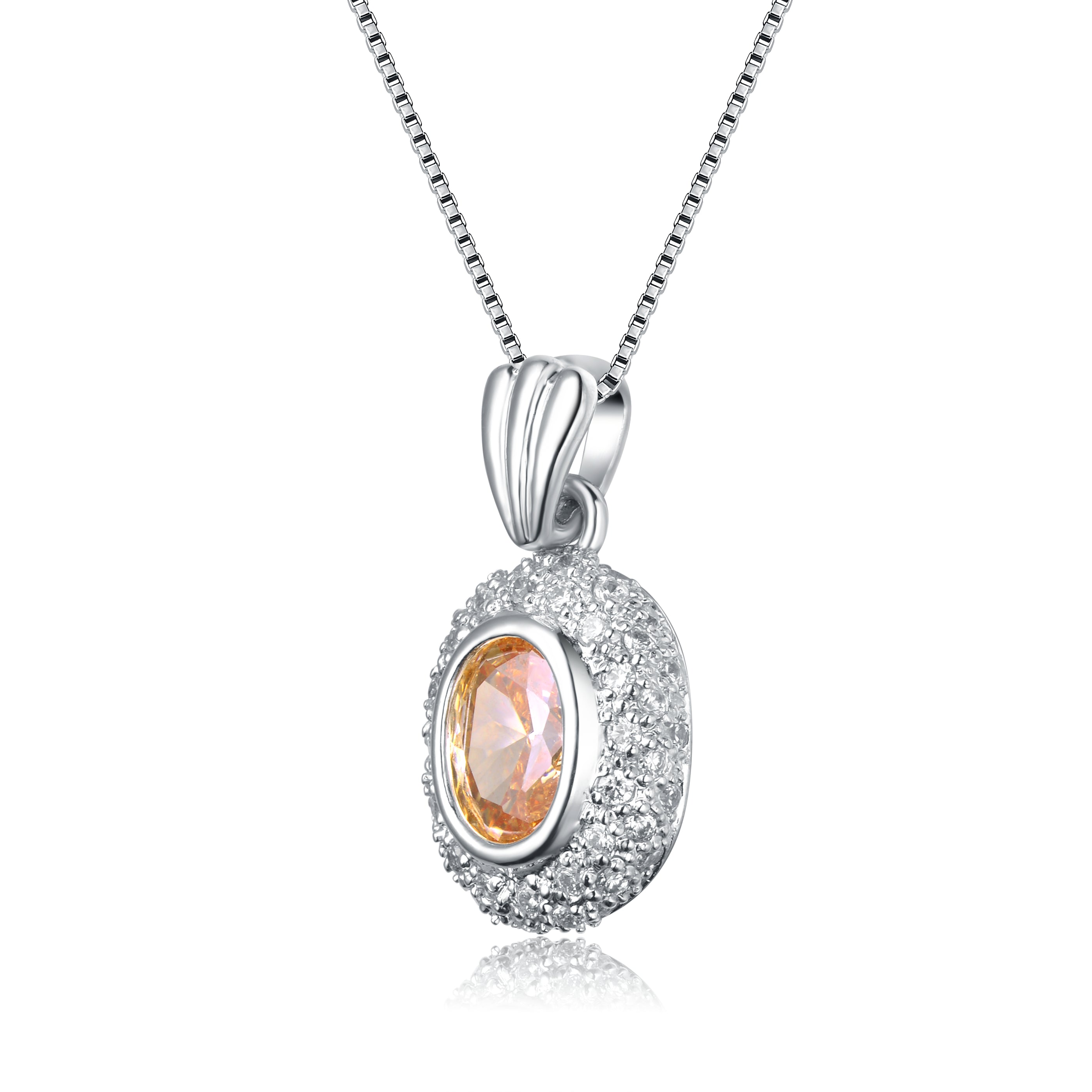A Champagne colored oval cubic zirconia solitaire makes up the center of this necklace. For a little extra shimmer it is surrounded by a halo of clear cubic zirconias.