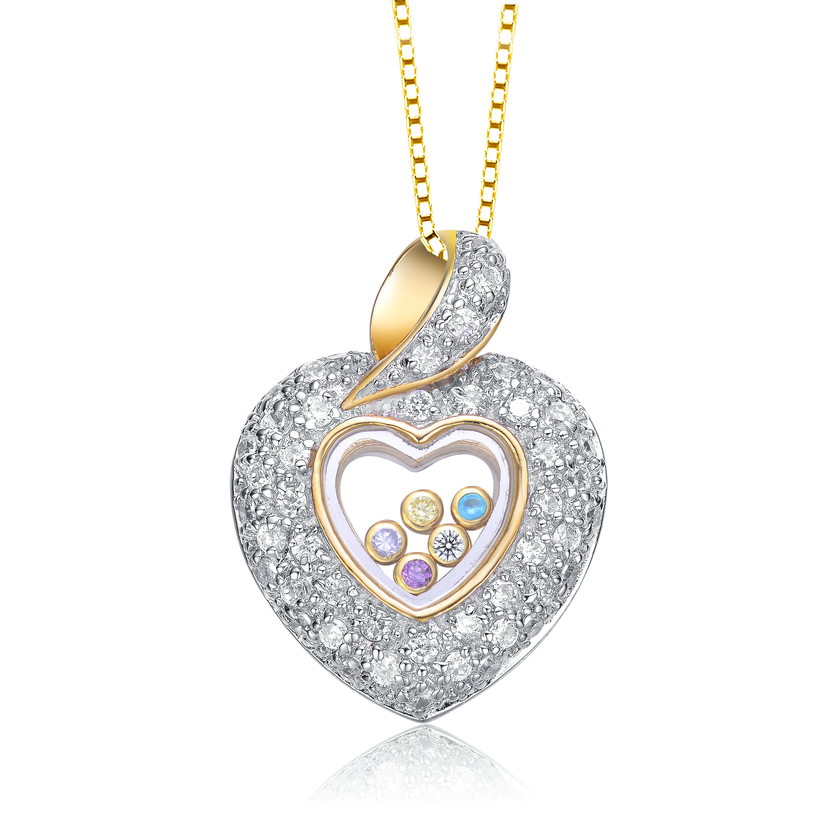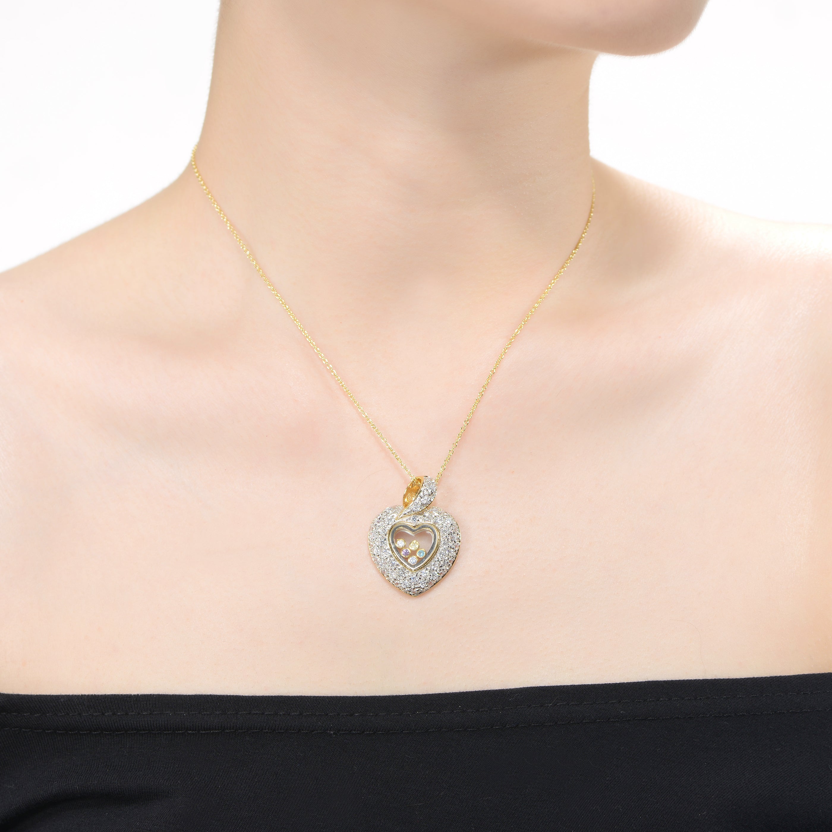 Don’t look any further for the prettiest heart necklace. This one displays an open heart encrusted with clear cubic zirconia stones and sprinkled with multicolored cubic zirconias at the core.
