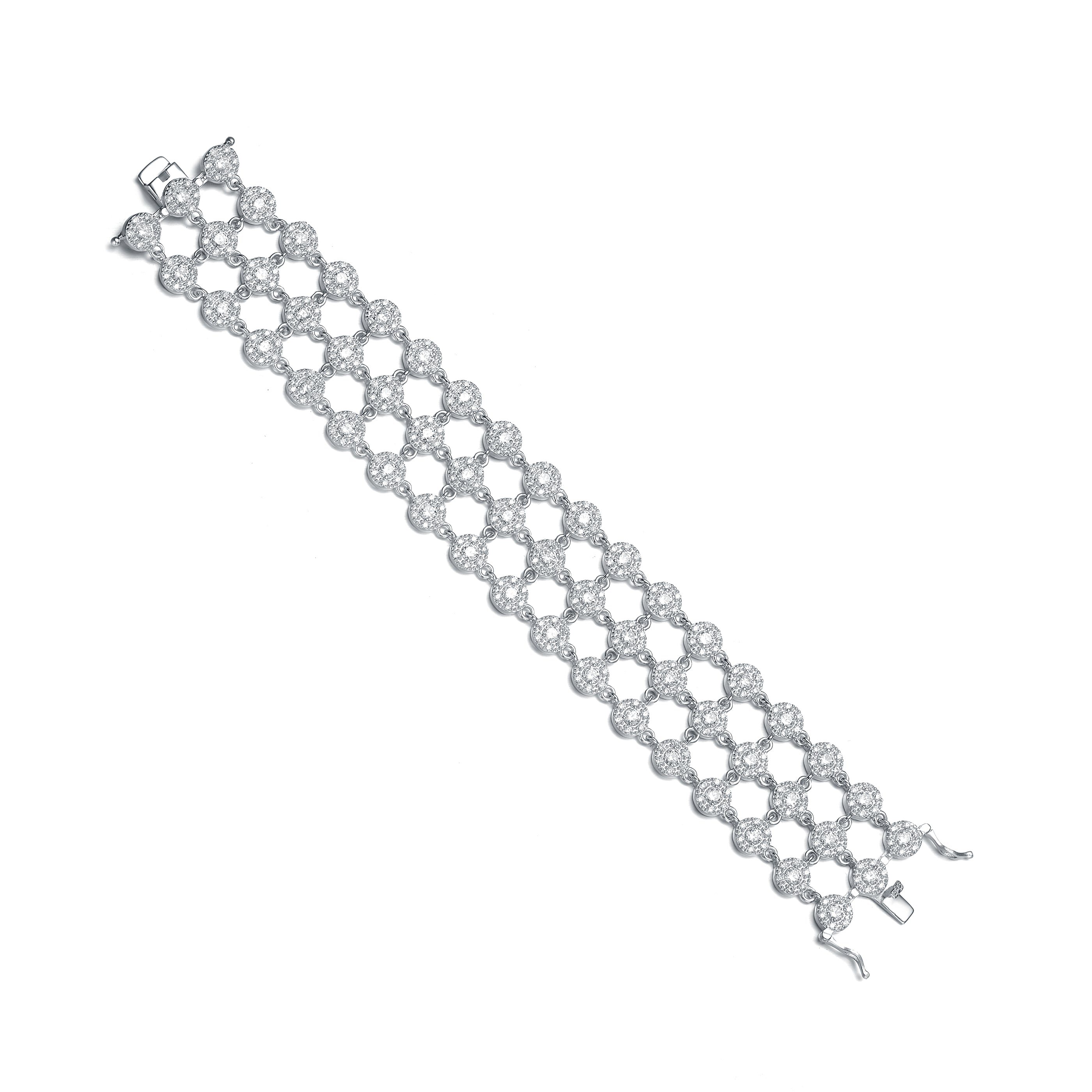 Unique bracelet feature round cut clear cubic zirconia stones in each circle and beautifully connected forming a lattice pattern. This lattice bracelet is made from .925 sterling silver secured with box clasp.