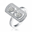 Classy and stylish cocktail ring. This. Sterling silver ring is versatile enough to complement your outfit. The shape features rectangle with irregular lateral sides that are actually curvy. The external frame is studded with small clear round cubic zirconia stones, while the center part is composed of three cubic zirconia stones. The center stone is smaller, while the two other stones on the side are larger. This ring set in Sterling silver with rhodium plated, comes in sizes 6, 7, 8.