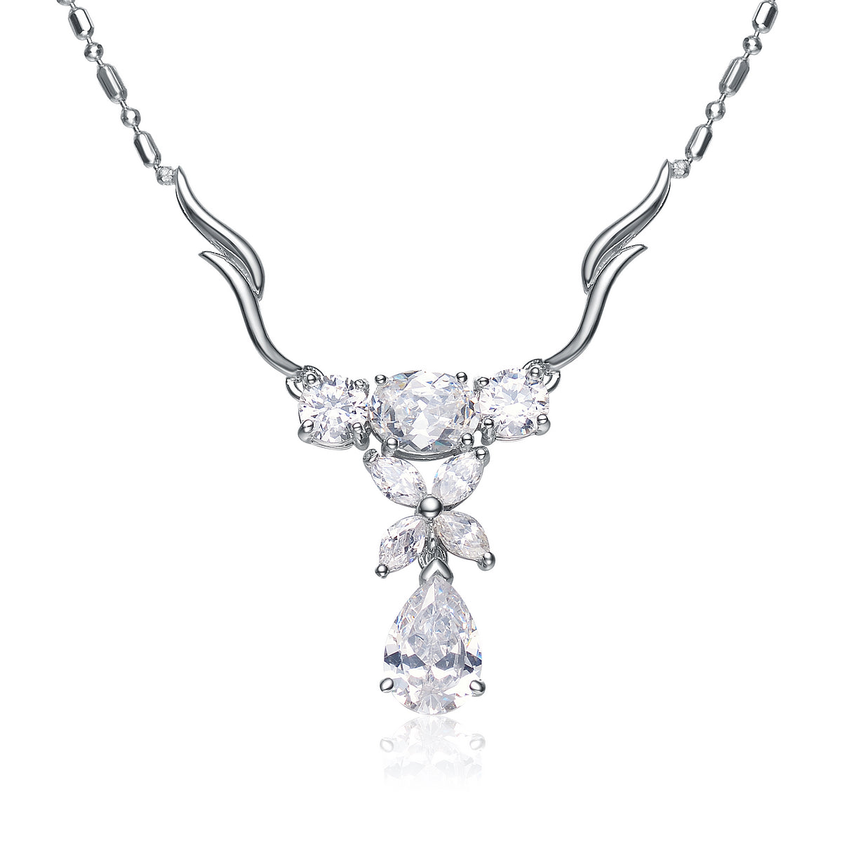 This sterling silver necklace is wonderfully crafted from fine silver that is bent to form bands, beads and loops. The pendant is a beautiful clear crystal that is held by embellished silver bands and beads; all together, this piece is a lovely formal wear that will make you shine like the moon and the stars.